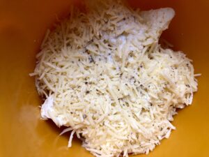 Frischkäse mit geriebenem Käse, Zitrone (Saft und Schale) vermischen. Das habe ich mit dem Handmixer gemacht.