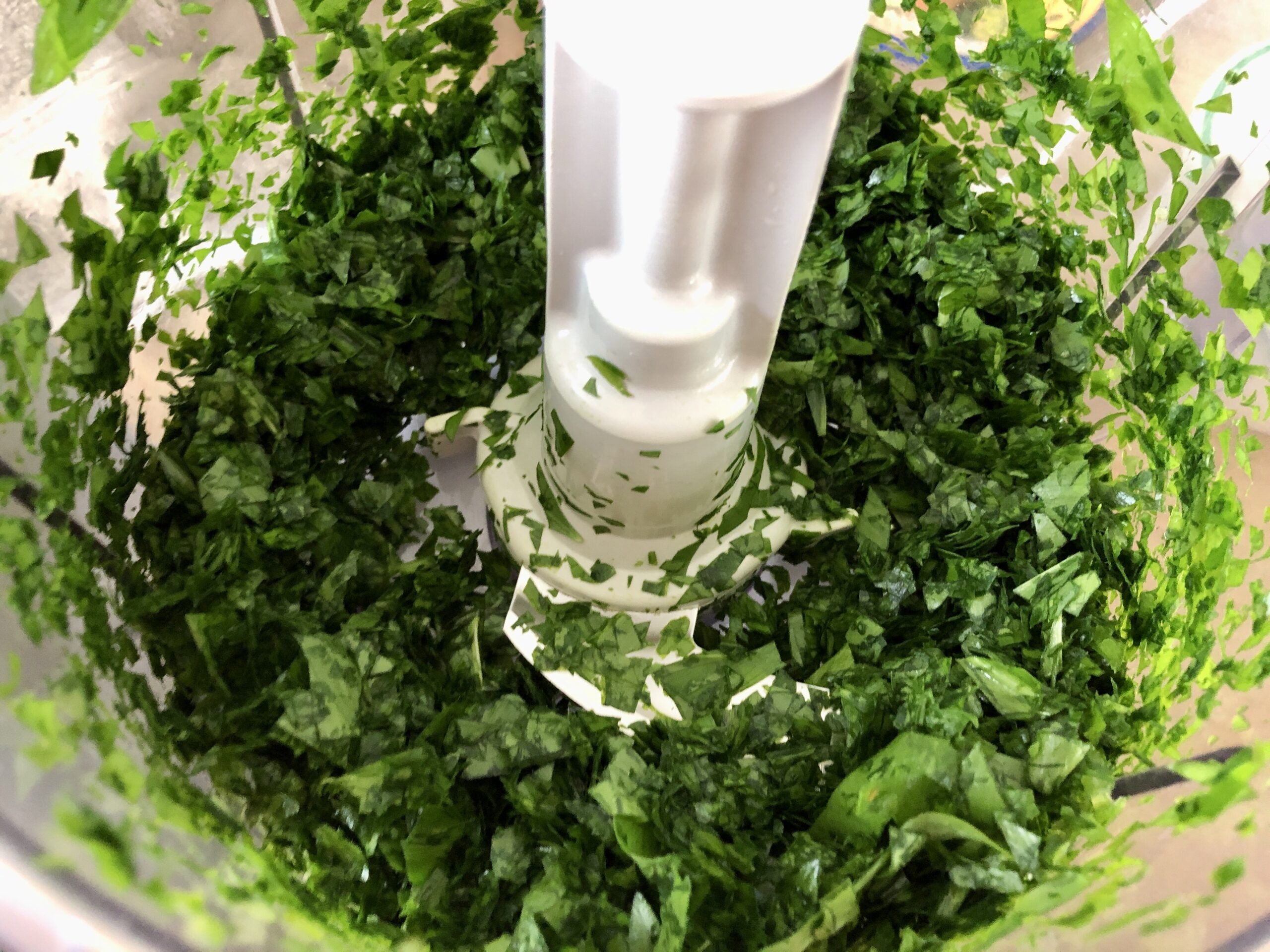 Stiele abtrennen und in der Küchenmaschine mit Pulsefunktion klein häckseln. Man kann natürlich auch das Messer nehmen, das dauert nur länger.
