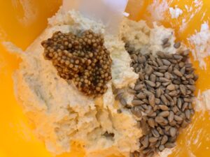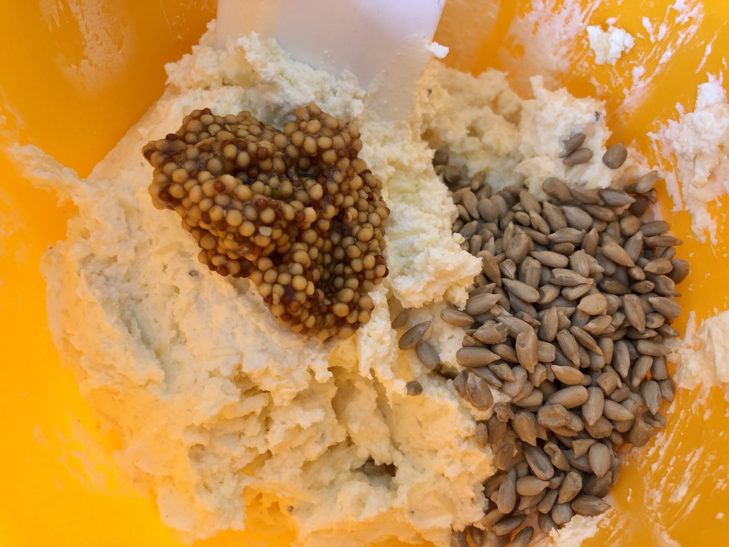 Senf und Sonnenblumenkerne dazu geben sowie Pfeffer und Salz. Man kann die Sonnenblumenkerne auch später aufstreuen.
