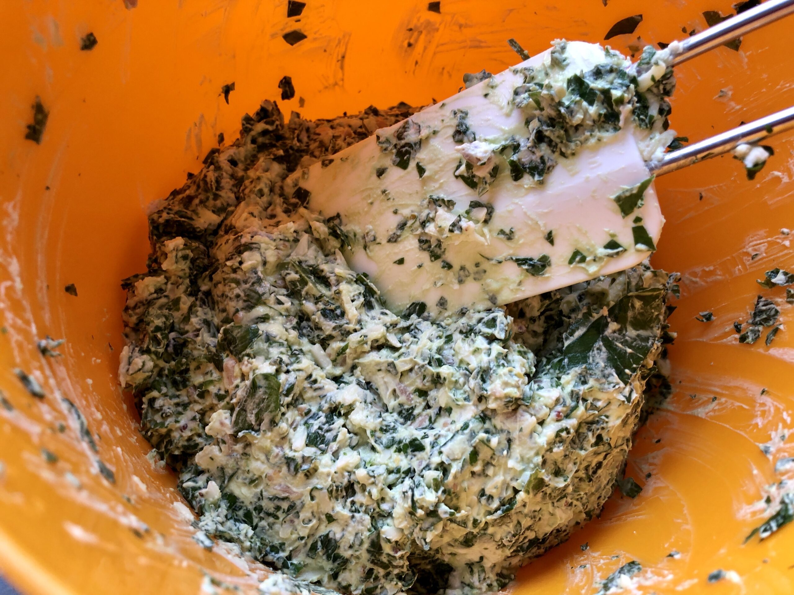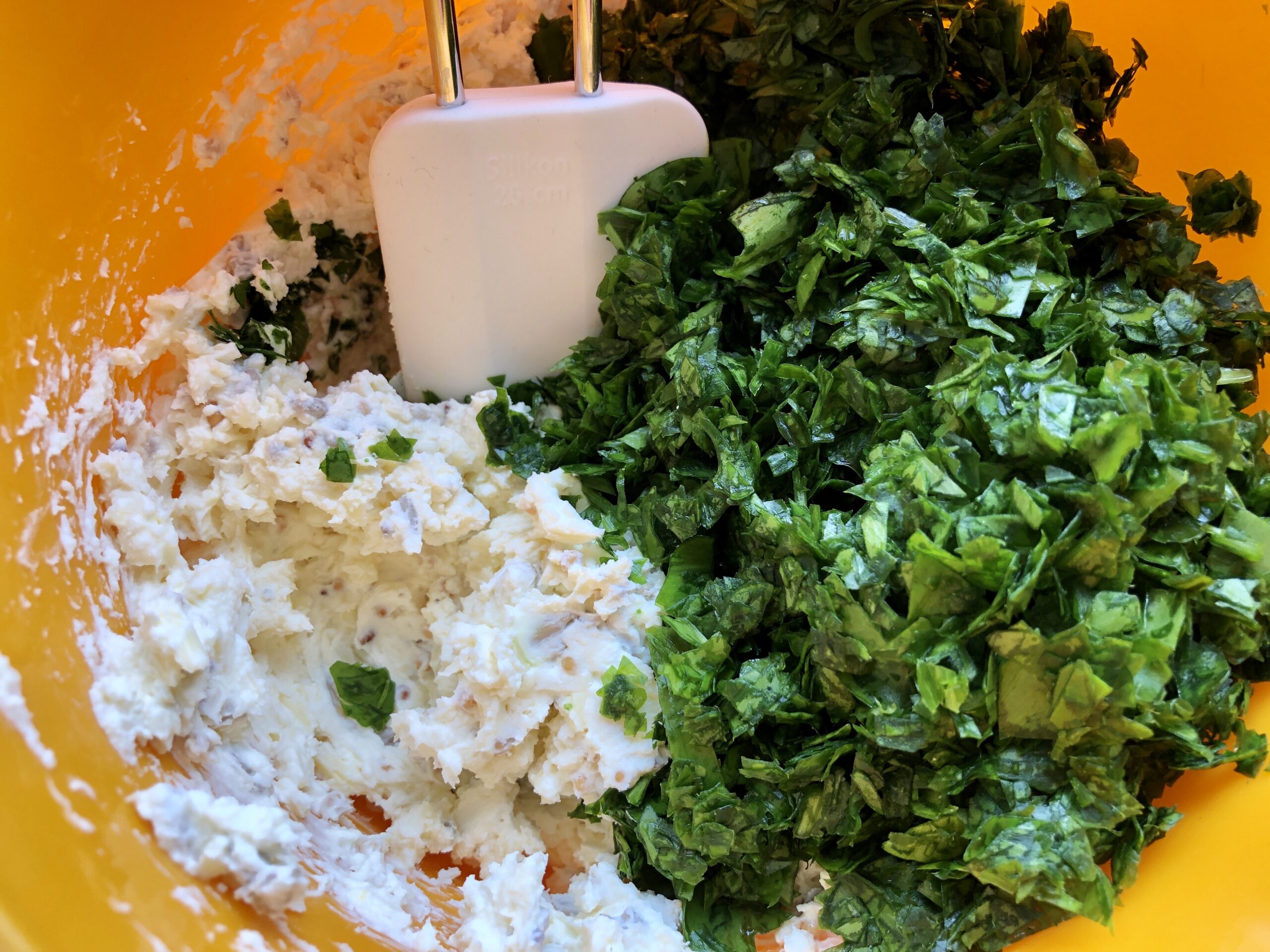 Gut vermischen, gehäckselten Bärlauch mit dem Küchenspatel unterheben. Nochmal abschmecken.