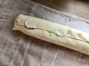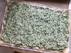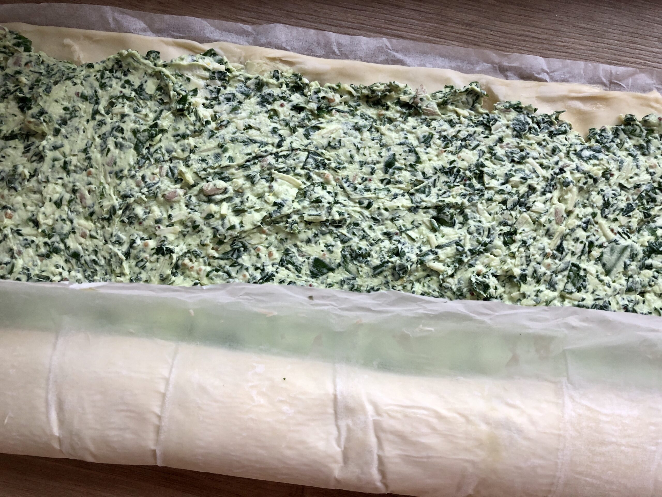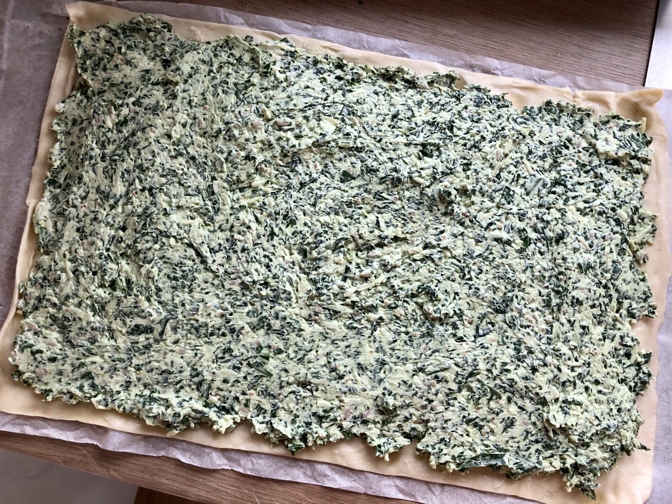 Blätterteig entrollen und auf dem Papier liegen lassen. Käse-Bärlauchpaste darauf verteilen, an den Rändern etwas Platz lassen, damit die Creme später nicht heraus quillt. Gegebenenfalls die Sonnenblumenkerne oder Tomatenstückchen jetzt erst gleichmäßig aufstreuen.
