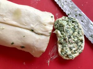 Wenn man Zeit hat ist es sinnvoll, die Rolle noch etwas in den Kühlschrank zu stellen. Nach mehreren Chargen habe ich festgestellt, das sie nach 2 Stunden Kühlung am besten die Form halten und am einfachsten zu schneiden sind.