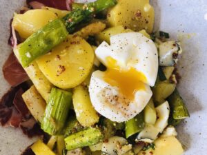 Kartoffeln, Spargel und Ei sind für mich eine einzigartige Kombination. Daher erfinde ich immer wieder andere Gerichte damit. Dieses hier ist auch so eine schnelle Variation. Den Spargel hatte ich gekauft, ohne an ein bestimmtes Rezept zu denken. Gekochte Pellkartoffeln waren da, Eier sowieso. Spargel koche ich überhaupt nicht mehr, sondern brate ich entweder in der Pfanne oder im Backofen. So bleibt der ganze Geschmack drin. Das habe ich hier mit grünem und weißen Spargelstücken gemacht. Wobei der grüne etwas kürzer gebraten wird. Die Kartoffeln habe ich extra nur leicht gebraten, ohne sie anzurösten, damit sie den Spargelgeschmack nicht überdecken. Alles wird mit einer schönen Vinaigrette aus Rapsöl und Weißweinessig mit körnigem Senf vermischt und obendrauf ein sehr kurz gekochtes Ei gesetzt, das innen noch richtig flüssig ist. Einfach köstlich, wenn sich das Eigelb mit den anderen Zutaten vermählt! Ich habe noch ein paar Scheiben italienischen Schinken dazu gelegt und wir hatten ein wunderbares Abendessen.