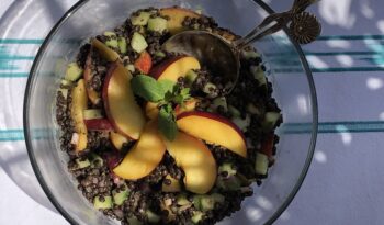 Für ihr Sommerfest wünschten sich Freunde einen pikanten Belugalinsensalat mit Obst als Beitrag fürs Buffet. Das war mal eine präzise Anweisung und so machte ich mich an Überlegung und Recherche. Diese wunderbaren kleinen schwarzen Linsen nehme ich gerne in der