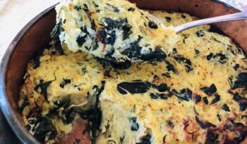Kugelis heisst dieser fantastische Auflauf in Litauen. Er ist superschnell gemacht und kommt definitiv ins Repertoire. Der Scamorza gibt dem Gericht eine tolle rauchige Note. Ich habe die Hälfte des Spinats durch Bärlauch ersetzt, der gerade in Massen vor der