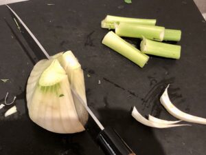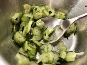 Die Knolle waschen, eventuelle bräunliche Stellen abschälen. Die Stiele abschneiden und aufheben. Den Boden abschneiden und die Knolle senkrecht auf ein Schneidbrett stellen. Von oben nach unten in 1,5 cm breite Scheiben schneiden.