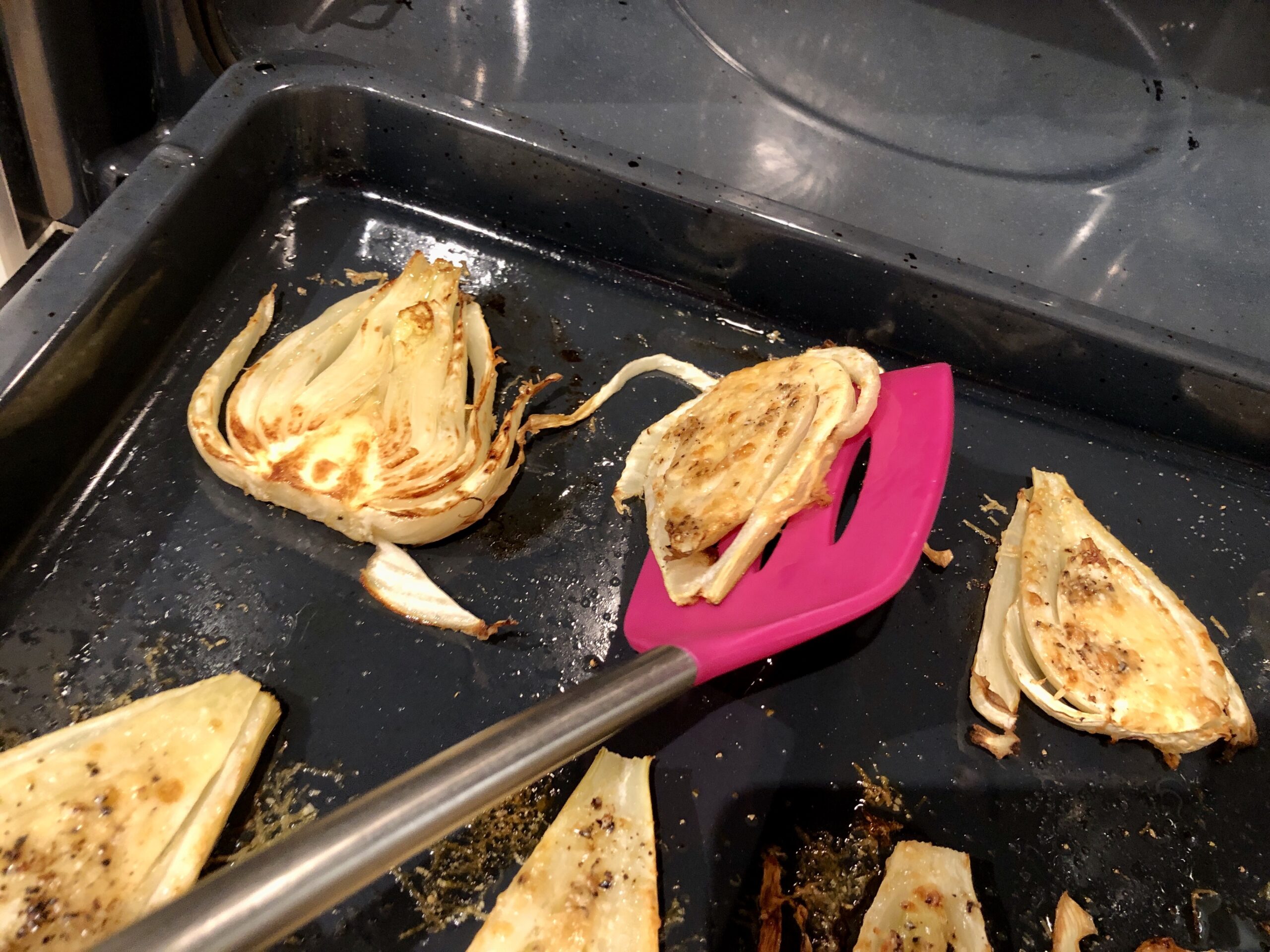Das Blech aus dem Ofen nehmen, die Fenchelscheiben wenden
