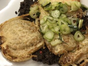 Die Scheiben auf einen Teller legen und den Salat aus den Stielen darüber geben. Ich habe die Fenchelscheiben dieses Mal auf stückigem Püree von Belugalinsen angerichtet.
