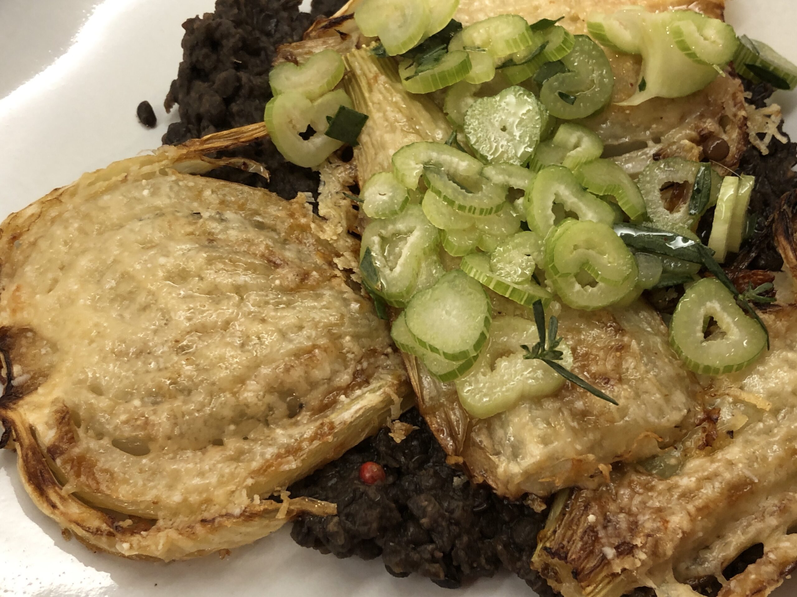 Fenchel ist ein so wunderbares Gemüse, vor Allem wenn er komplett verarbeitet wird wie in diesem Rezept. Weich und knusprig im Ofen geröstet, die knackigen Stiele extra als kleiner Salat obenauf. Ich habe ihn auf einem Bett aus schwarzen Linsen angerichtet, die vom Vortag noch übrig waren. Er passt aber auch als Beilage, Vorspeise oder auf ein Buffet. Man kann ihn gut lauwarm essen. Schnell gemacht, gesund und köstlich!