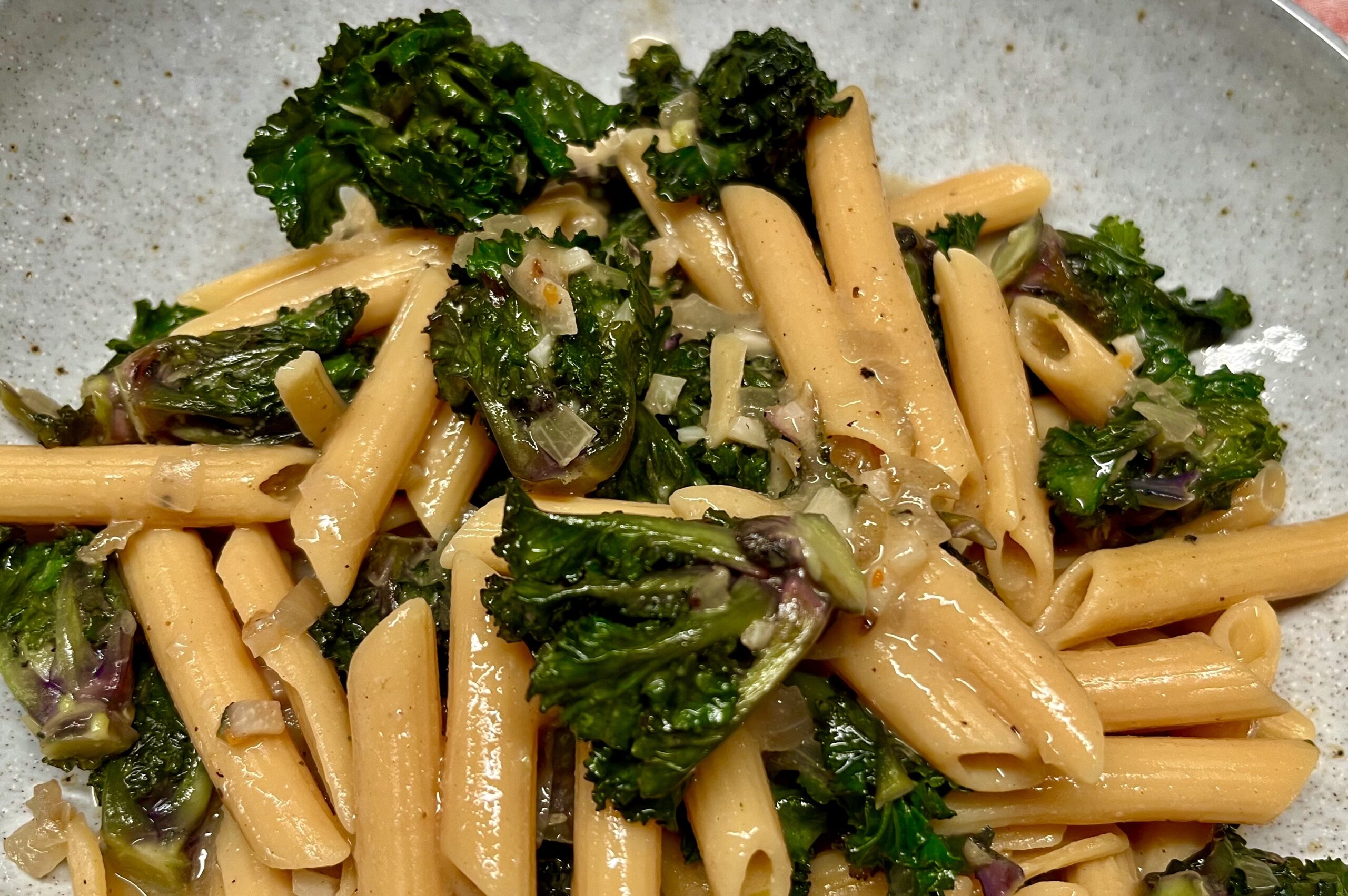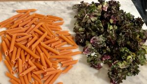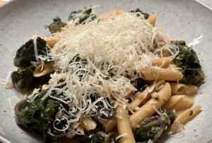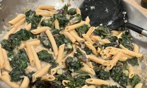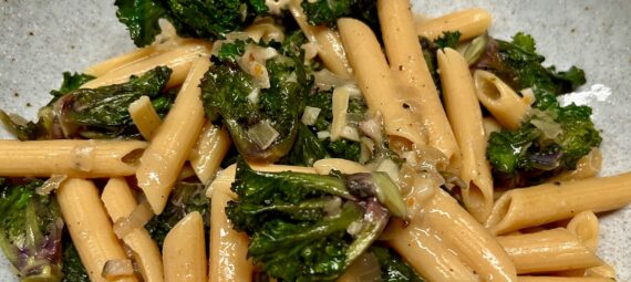 Schmecken köstlich, sind gesund und unübertroffen schnell in der Zubereitung. Man muss sie einfach am Stiel sauber abschneiden, das war’s. Nicht zu vergleichen mit der Arbeit und dem Abfall, den man mit Rosenkohl hat. Und einfach in der Zubereitung. Nur mit Knoblauch und Zwiebel angebraten sind sie eine tolle schnelle Gemüsebeilage. Ich wollte sie mal mit Pasta machen und bin auf ein vielversprechendes Rezept mit einer cremigen Soße gestoßen, was ich natürlich etwas abgewandelt habe. Wir waren begeistert. Ich habe Linsen-Penne genommen und das Ganze vegan angelegt, weil wir nach der Weihnachtszeit kürzer treten wollen.
