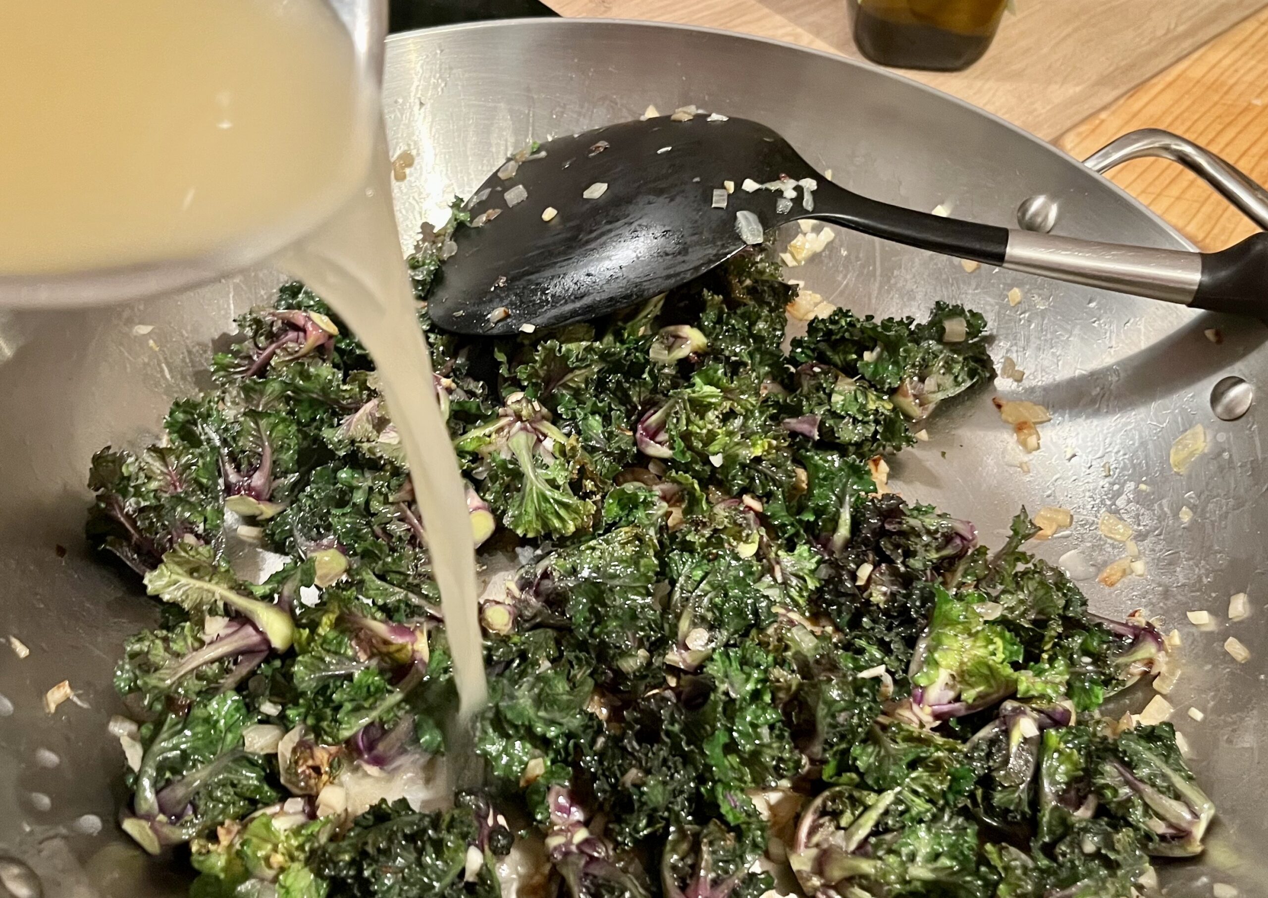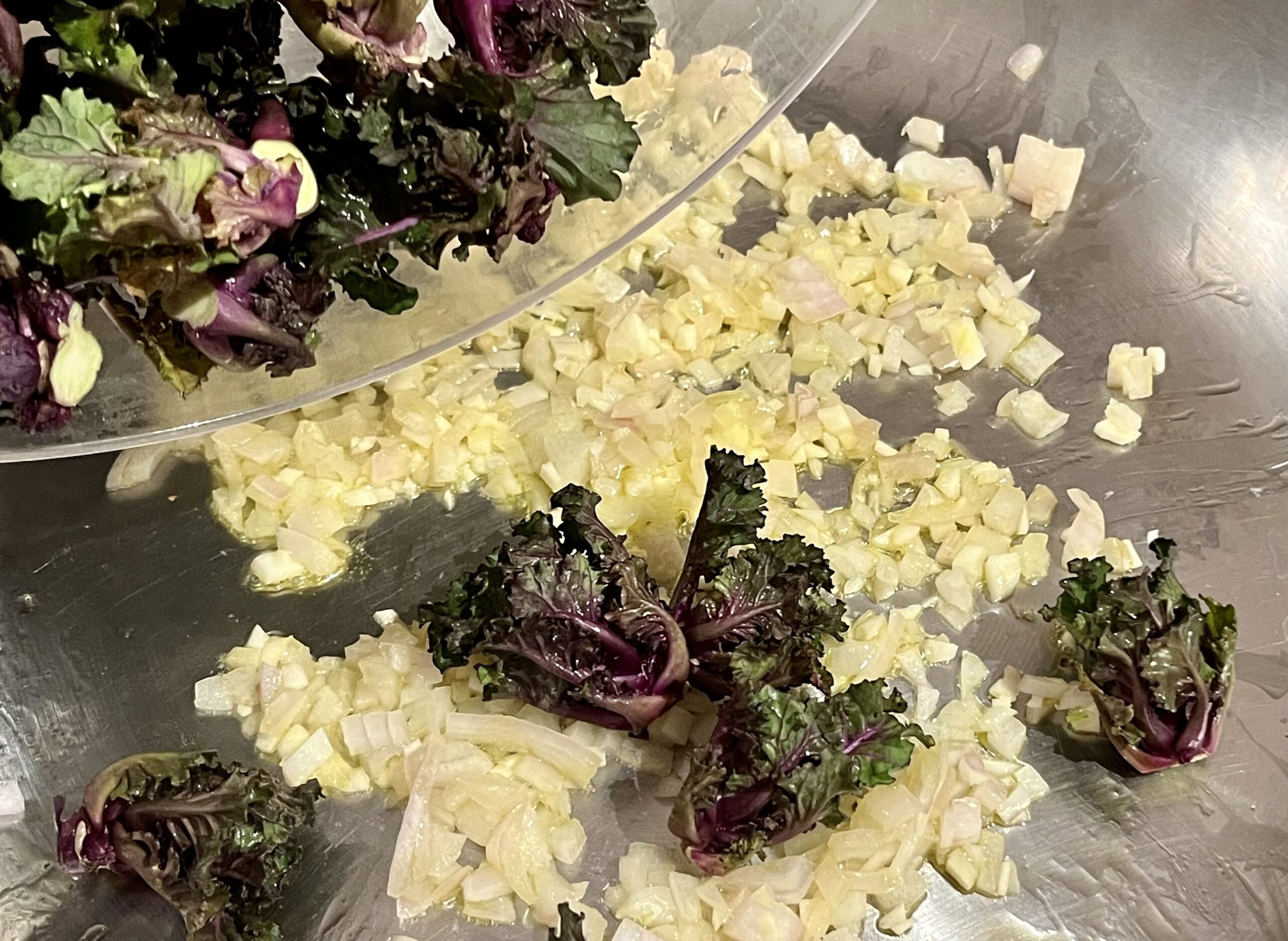 In einer ausreichend großen Pfanne das Olivenöl erhitzen, Zwiebel und Knoblauch glasig anschwitzen. Die Kohlröschen dazugeben und bei mittlerer Hitze ein paar Minuten anbraten, bis sie leicht braun sind.