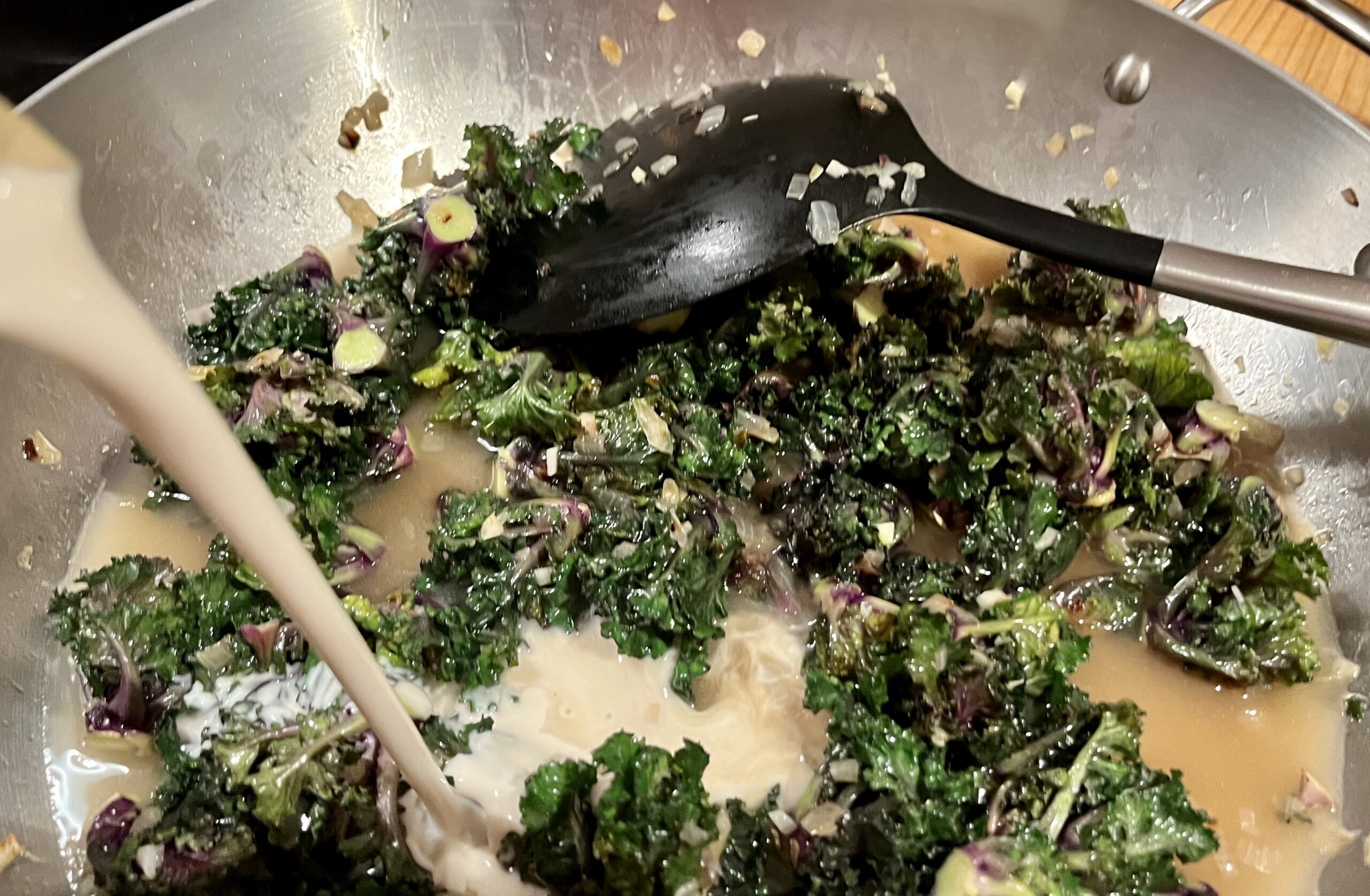 Gemüsebrühe angießen, verrühren und und Hafercreme dazugeben.