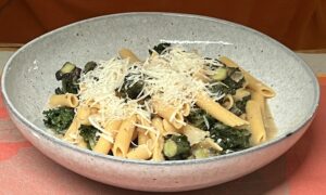 Gut vermengen, evtl etwas Nudelkochwasser hinzu fügen. Nochmal abschmecken mit Zitronensaft und je nach Bedarf Pfeffer und Salz. Anrichten, mit oder ohne Parmesan ein Genuss!