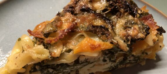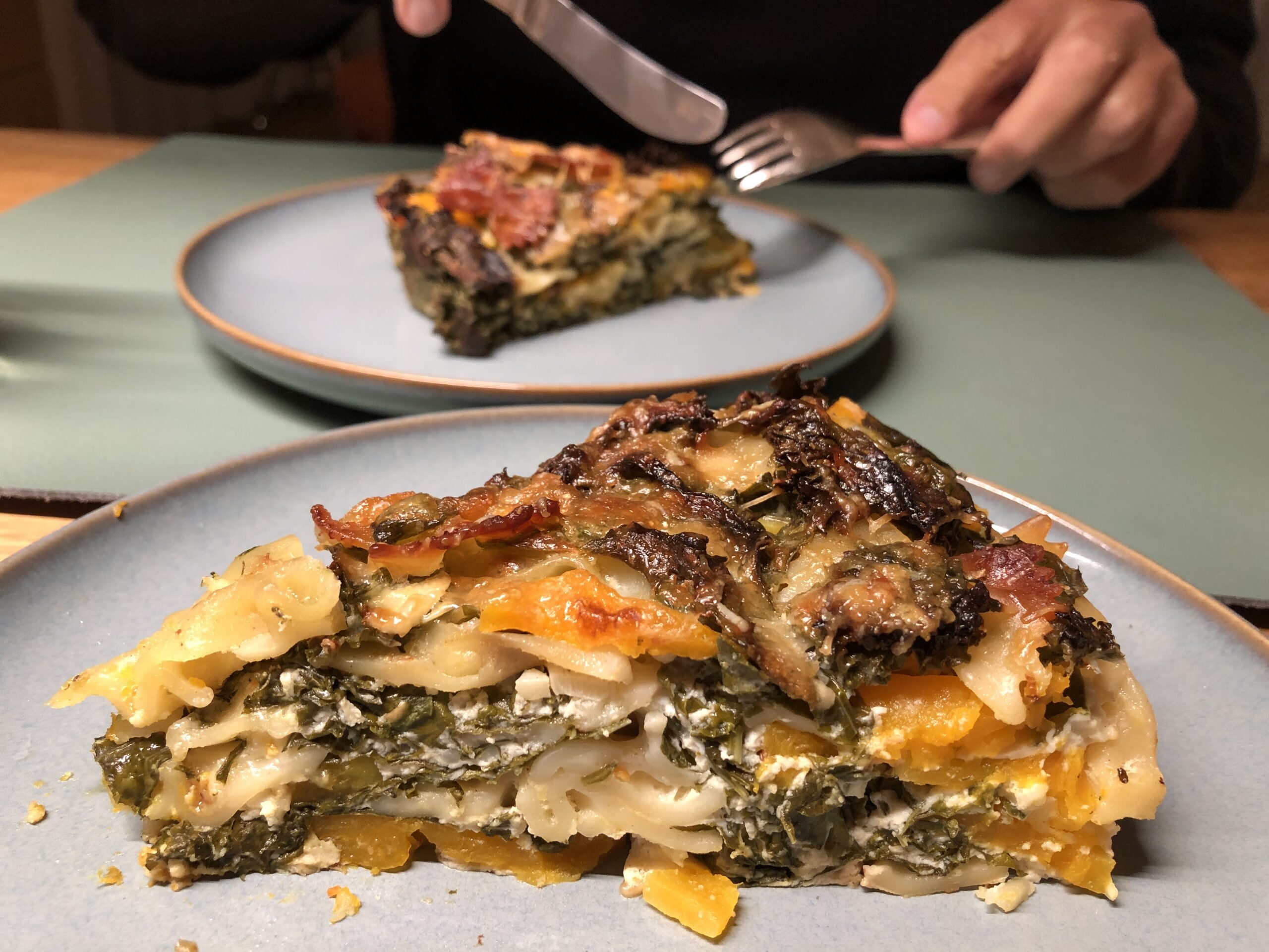 Als ich das Foto dieses herrlichen Torte auf einem amerikanischen Foodblog sah wusste ich sofort: die ist was für mich! Die Zutatenliste hat das bestätigt. Allerdings war gerade Sommer – somit keine Kürbiszeit und so geriet die Notiz in Vergessenheit – bis sie neulich irgendwie aufgeploppt ist. Ich habe das als Zeichen gesehen und mich sofort ans Einkaufen gemacht. Da gab es diesen taufrischen Grünkohl im Bioladen und ich habe entschieden, dass das Rezept ein wenig verändert wird, anstatt Spinat nun Grünkohl. Dazu Ricotta, Parmesan und Taleggio, da tanzen die Geschmacksnerven! Interessant auch, dass die Pasta ungekocht hinein kommt, sozusagen eine gebackene One Pot Pasta. Hier ist es – ein deftiges Gericht, das schön aussieht und wunderbar mundet. Die Zutatenliste ist zwar lang, aber es ist schnell gemischt. Für das Backen und Ruhen muss man allerdings 2 Stunden einplanen.