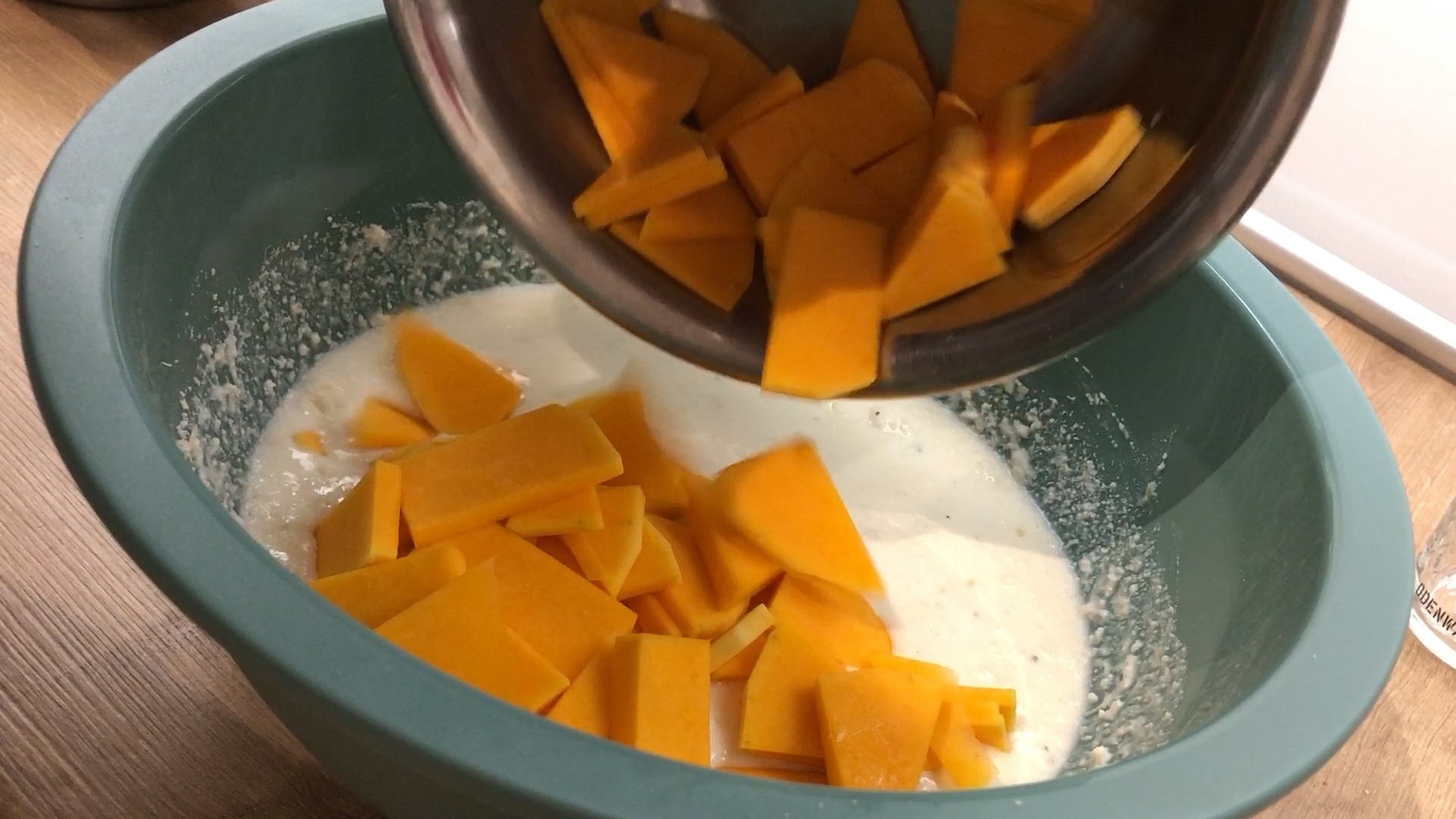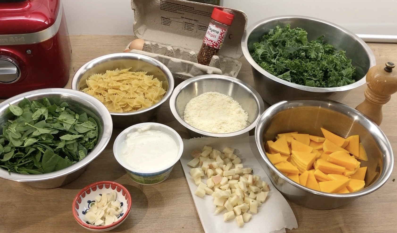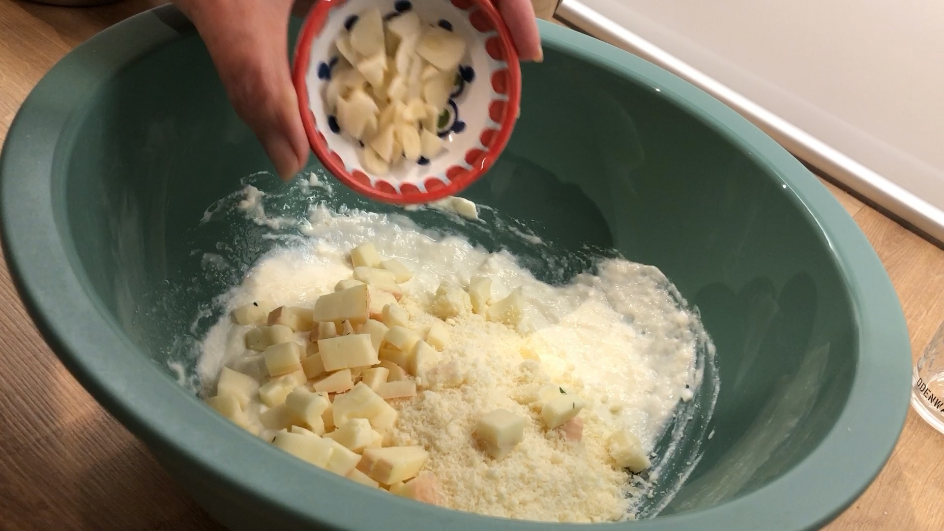 Vor dem Mischen den Backofen auf 180 Grad Umluft vorheizen. Zunächst die Eier in der Schüssel etwas verquirlen, dann den Ricotta zugeben und verrühren. Nun nacheinander 60 gr Parmesan, den Taleggio, den Knoblauch, die Gemüsebrühe sowie einen guten Schuss Öl dazu geben und gut verrühren.