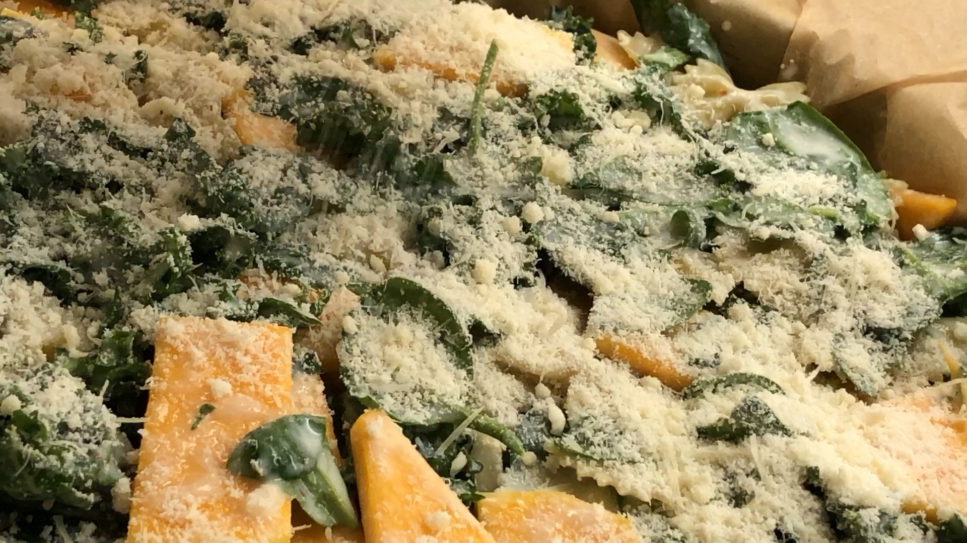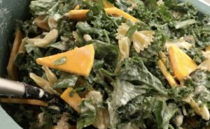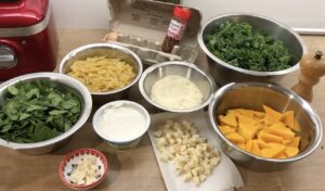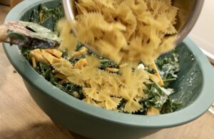 Nun den Kürbis, den Grünkohl und den Spinat hinein rühren. Zum Schluss kommen noch die Nudeln dazu.