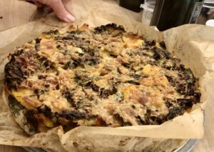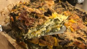 Zudecken und eine Stunde im Ofen backen. Danach den Deckel abnehmen, die Torte mit Olivenöl beträufeln und mit dem Rest des Parmesans bestreuen. Eine weitere Stunde offen backen, damit die Oberfläche knusprig wird. Dann muss die Torte auf einem Rost erstmal 30 Minuten ruhen, damit sie beim Schneiden nicht auseinander fällt. Nun die Springform lösen und das Papier vom Rand der Torte lösen.