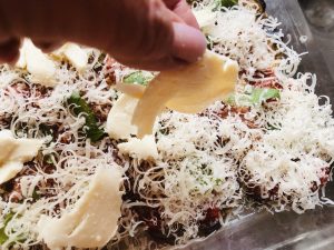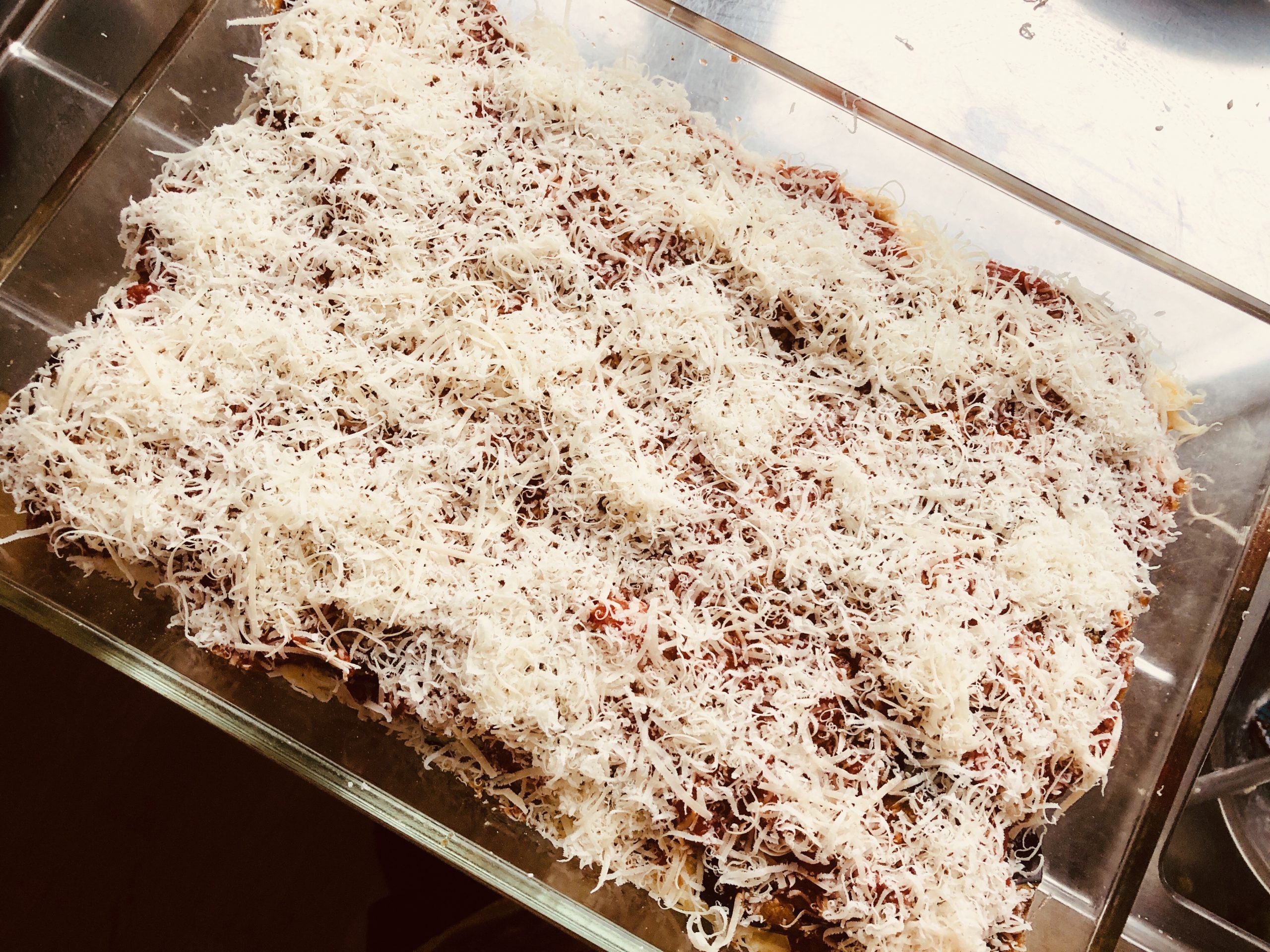 Reichlich Parmesan darüber streuen und dann die Hälfte des Mozzarellas verteilen.