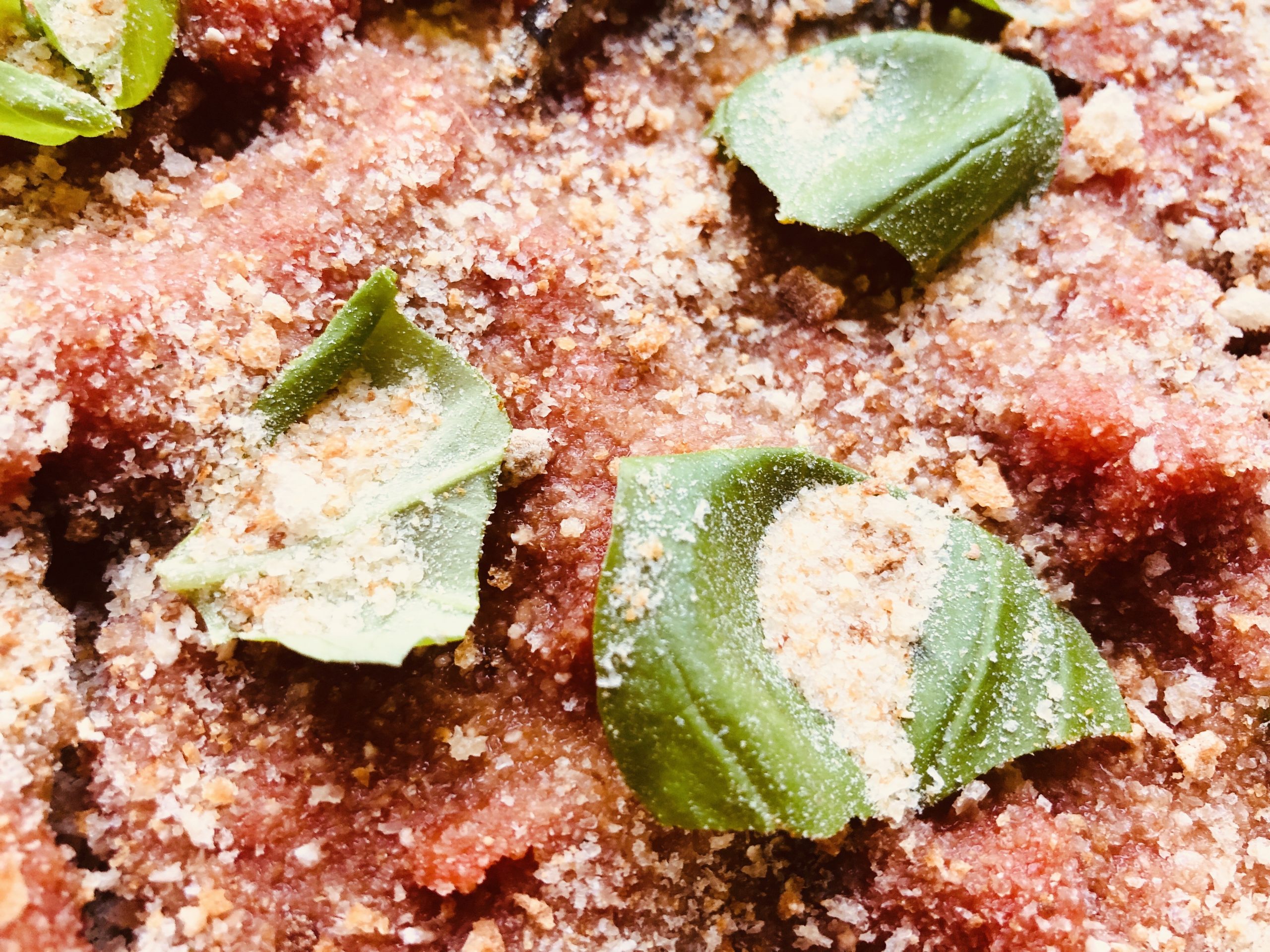 Ein paar Blättchen Basilikum zerreißen und auf der Soße verteilen, nun die Semmelbrösel.