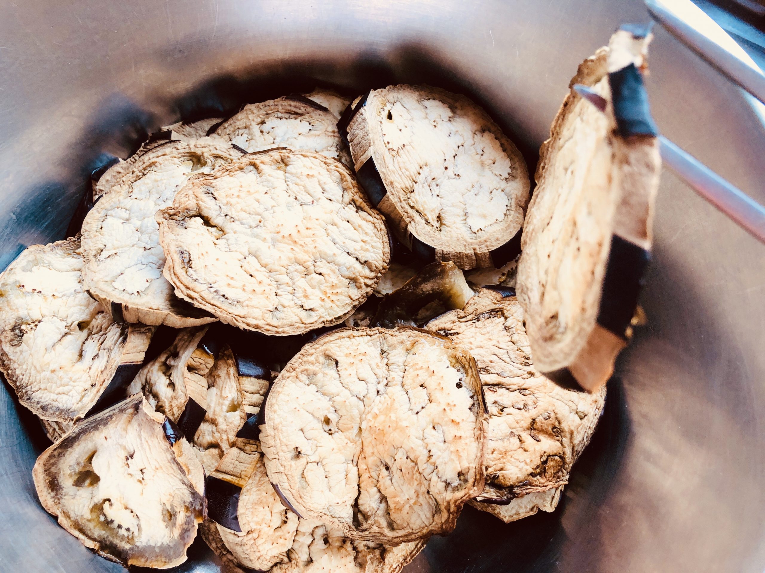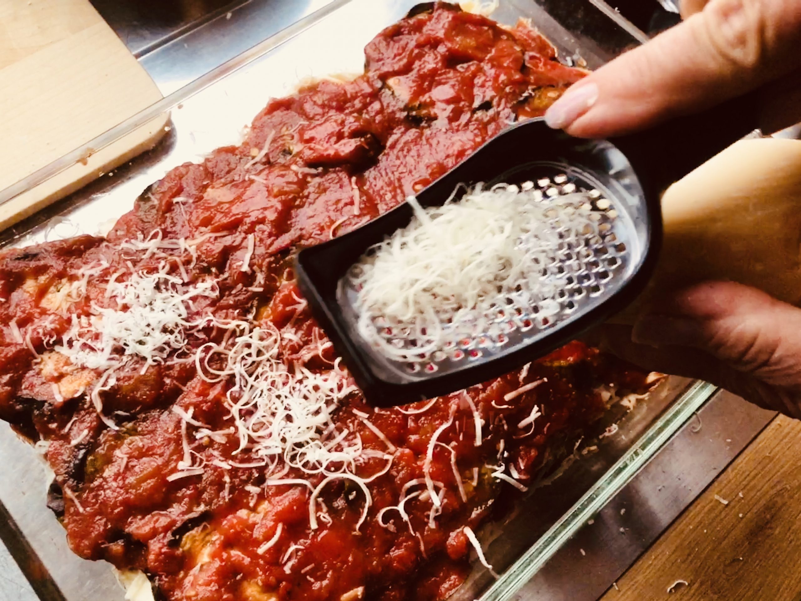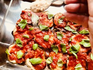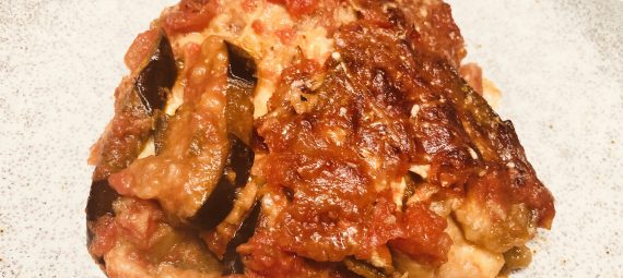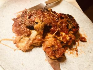 Bis hierhin kann man die Parmigiana vorbereiten und dann rechtzeitig vor dem Essen in den Ofen schieben, 45 Minuten bei 180 Grad backen und vor dem Servieren noch etwas sitzen lassen.