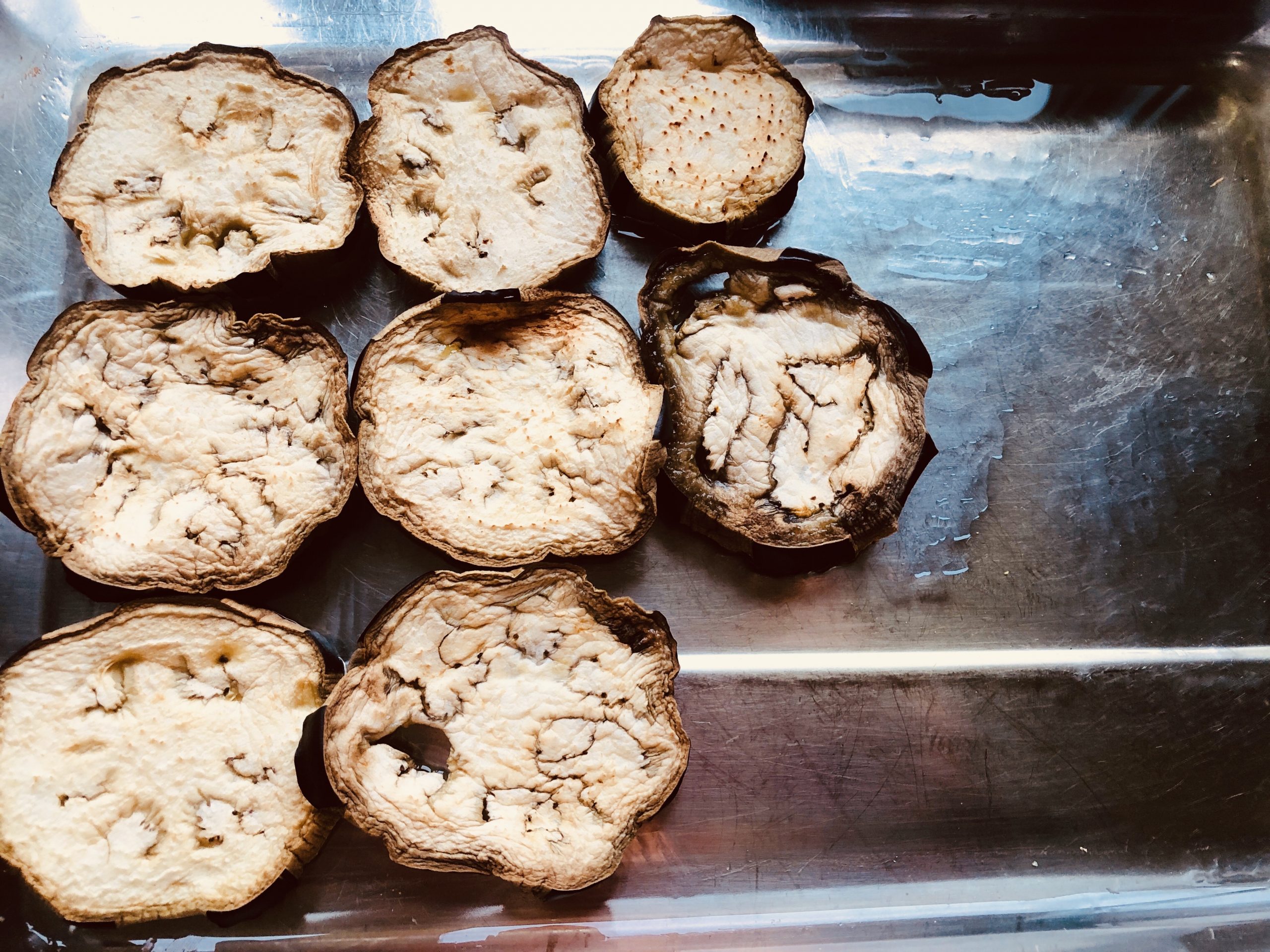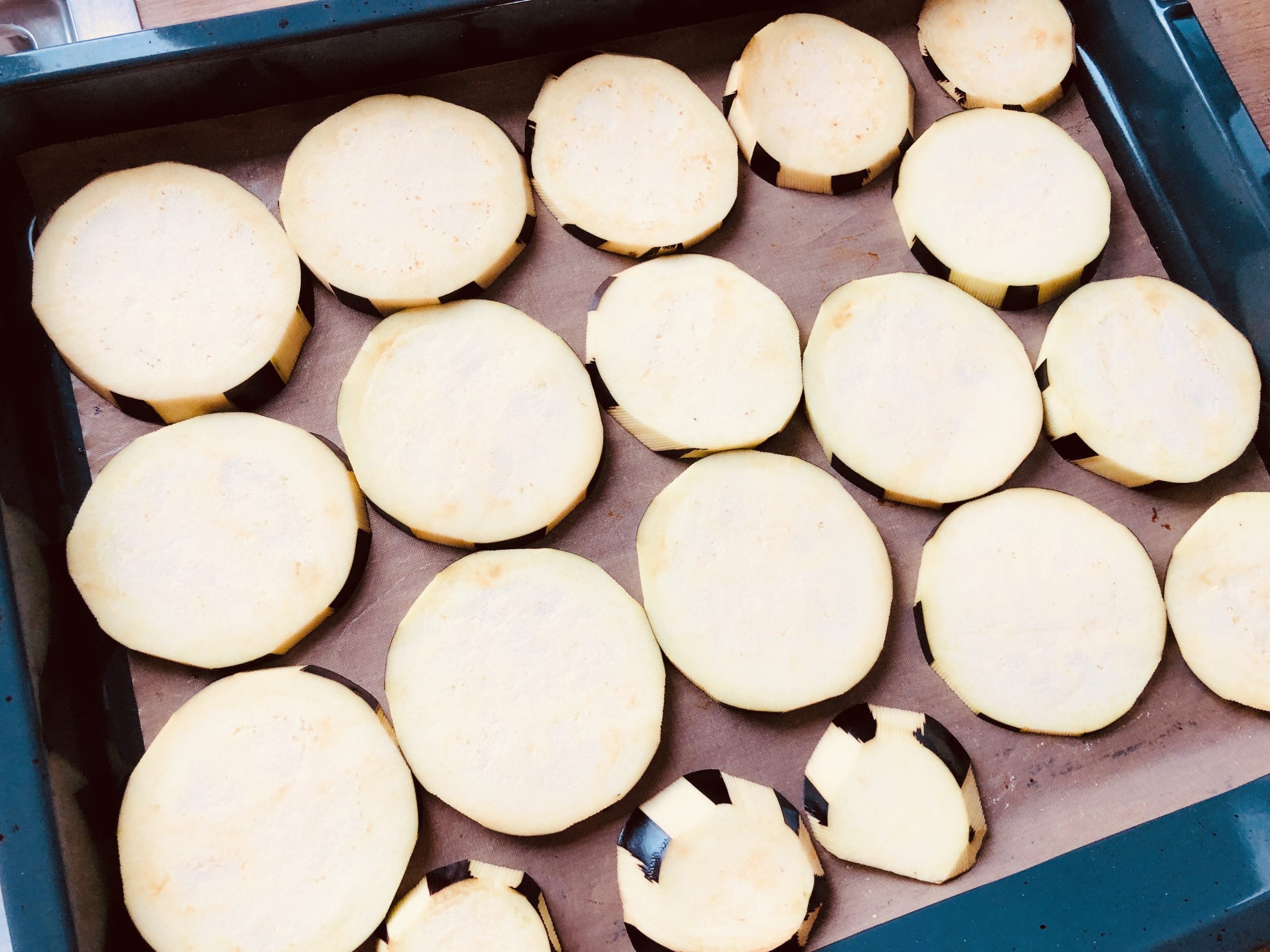 Dann in knapp 1 cm dicke Scheiben schneiden. Auf ein Backblech mit Backpapier nebeneinander legen und im Ofen rösten, bis sie weich sind.