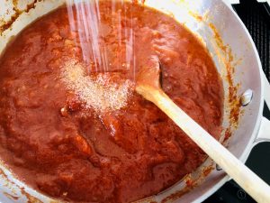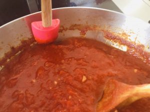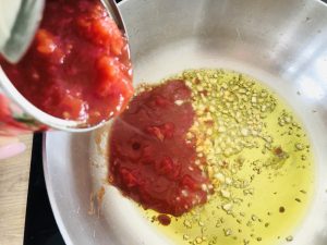 Zur gleichen Zeit die Tomatensoße zubereiten: den Knoblauch klein schneiden und in etwas Olivenöl anschwitzen, dann die Tomaten dazu schütten, umrühren und bei mittlerer Hitze einkochen lassen, mindestens eine halbe Stunde.