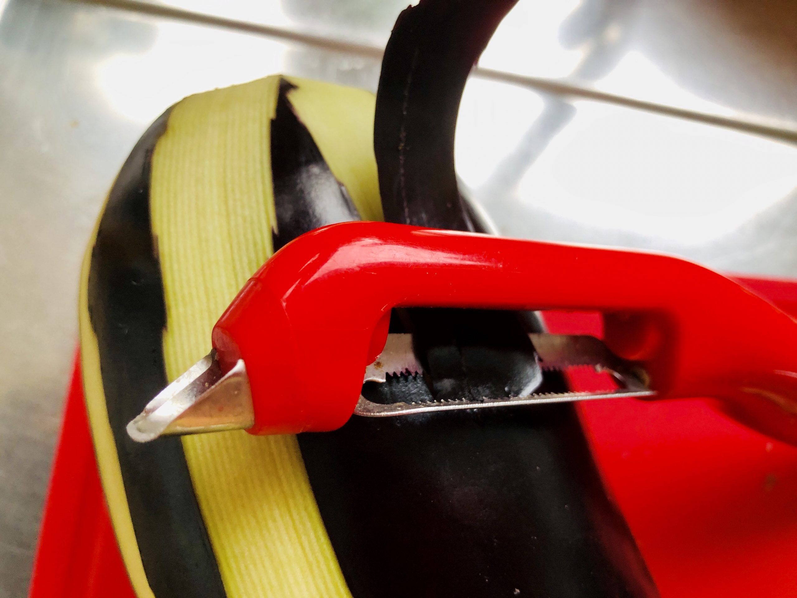 Die Auberginen streifig schälen, weil die Haut manchmal etwas dick sein kann.