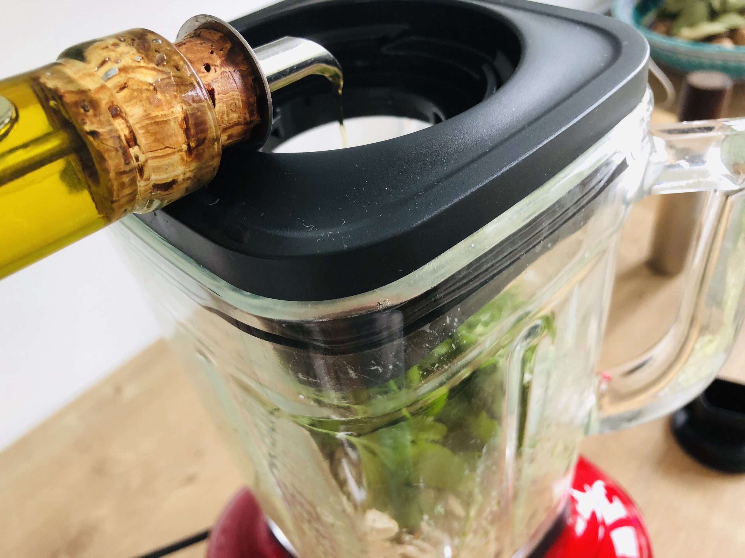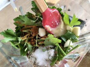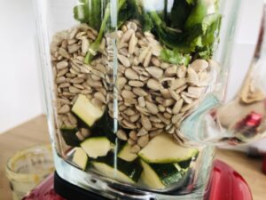 Sonnenblumenkerne 2 Stunden einweichen, abgießen, abtropfen. Zucchini grob schneiden, Knoblauchzehen halbieren. Kräuter waschen, trocknen und grob zerkleinern. Alle Zutaten außer dem Öl zusammen in einen Mixer, Küchenmaschine oder Foodprocessor geben und pürieren.