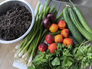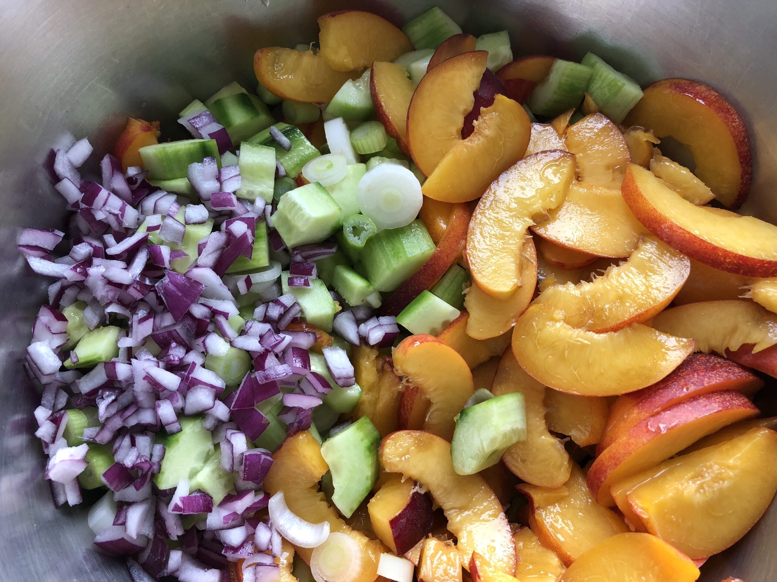 Die Linsen kurz waschen und in der dreifachen Menge Wasser erst aufkochen, dann köcheln lassen. Circa 20 Minuten, zwischendurch testen, wie weich sie sind. Sie sollten noch etwas Kern haben. Ich koche sie entgegen allen Anweisungen mit Salz, dann haben sie gleich Geschmack. Damit es schneller geht, füge ich noch etwas Haushaltsnatron dazu. In ein Sieb abschütten und abkühlen lassen. Frühlingszwiebeln und Zwiebeln klein schneiden. Die Gurke streifig schälen, längs halbieren, mit einem Löffel die Kerne entfernen und jede Hälfte nochmal längs in drei Teile schneiden, dann quer in kleine Stücke. Nektarinen in Spalten schneiden und die eventuell wiederum halbieren. Ein paar Spalten für die Deko beiseite stellen. Minze hacken.