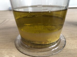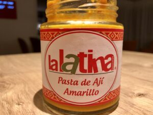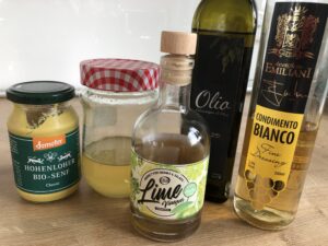 weißer Balsamessig, Olivenöl, scharfer Senf, Honig, etwas pikante Soße oder Paste. Ich habe mexikanische Aji-paste genommen. Salz + Pfeffer.