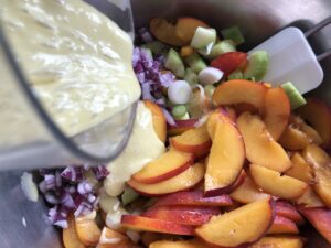 Es soll auf jeden Fall etwas sommerliches sein. Aprikosen sehen schön aus und schmecken gut, haben mich aber nicht überzeugt, Melonen? Hmmm… Aber dann – bin ich auf Nektarinen gestoßen und die haben mich angelacht. Der Rest war einfach. Das Wichtigste ist immer eine gute, pikante und süß-säuerliche Vinaigrette. Der Salat hat köstlich frisch, fruchtig und pikant geschmeckt und kam gut an. Wichtig: die Linsen dürfen nicht zu weich gekocht sein und der Salat darf erst kurz vor dem Servieren vorsichtig gemischt werden, weil die Linsen stark abfärben und die schöne Farbe der Nektarinen nicht zur Geltung kommt.