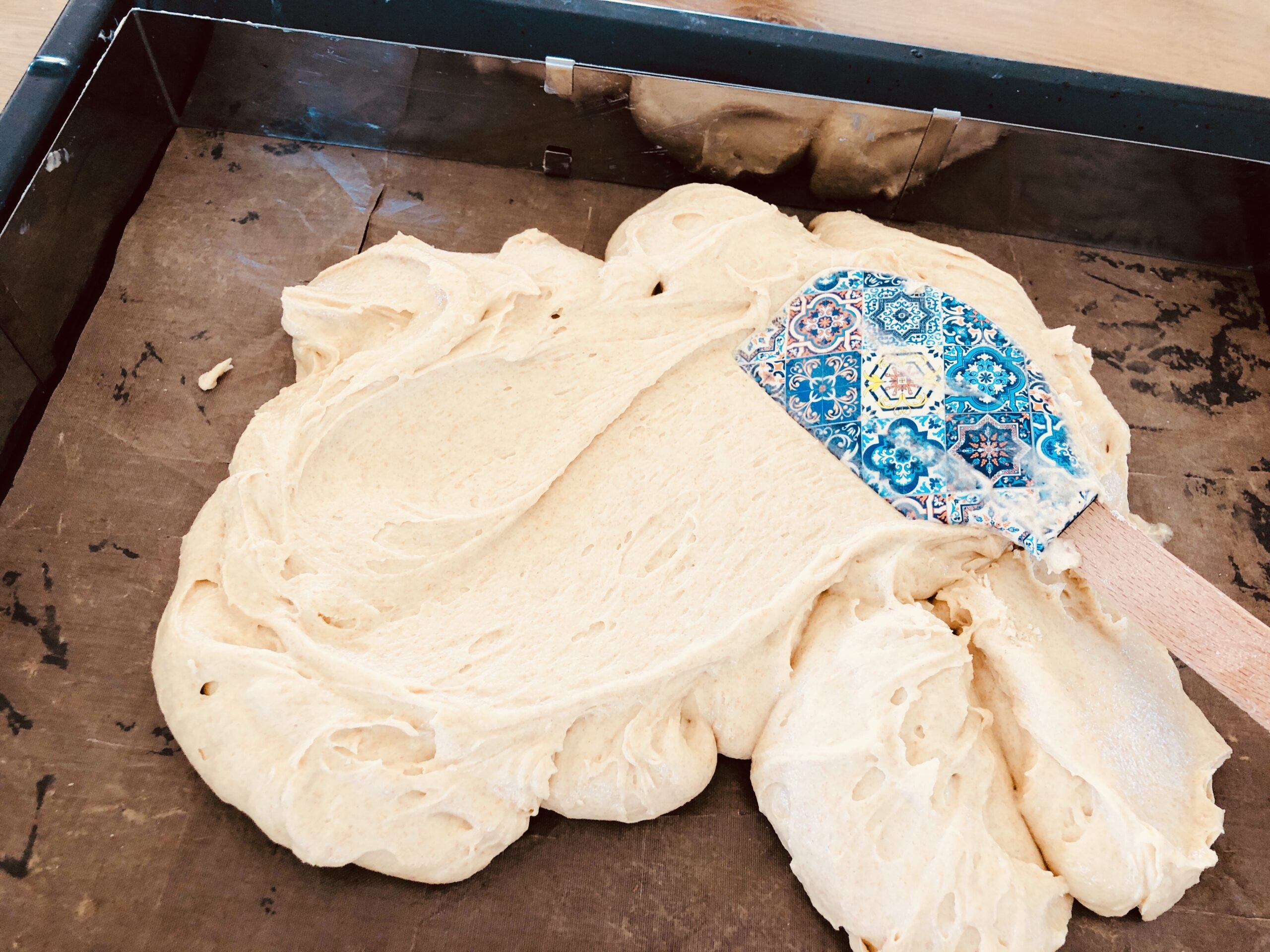 Teig auf ein mit Backpapier ausgeschlagenes Backblech geben und mit einer Palette schön glatt streichen.