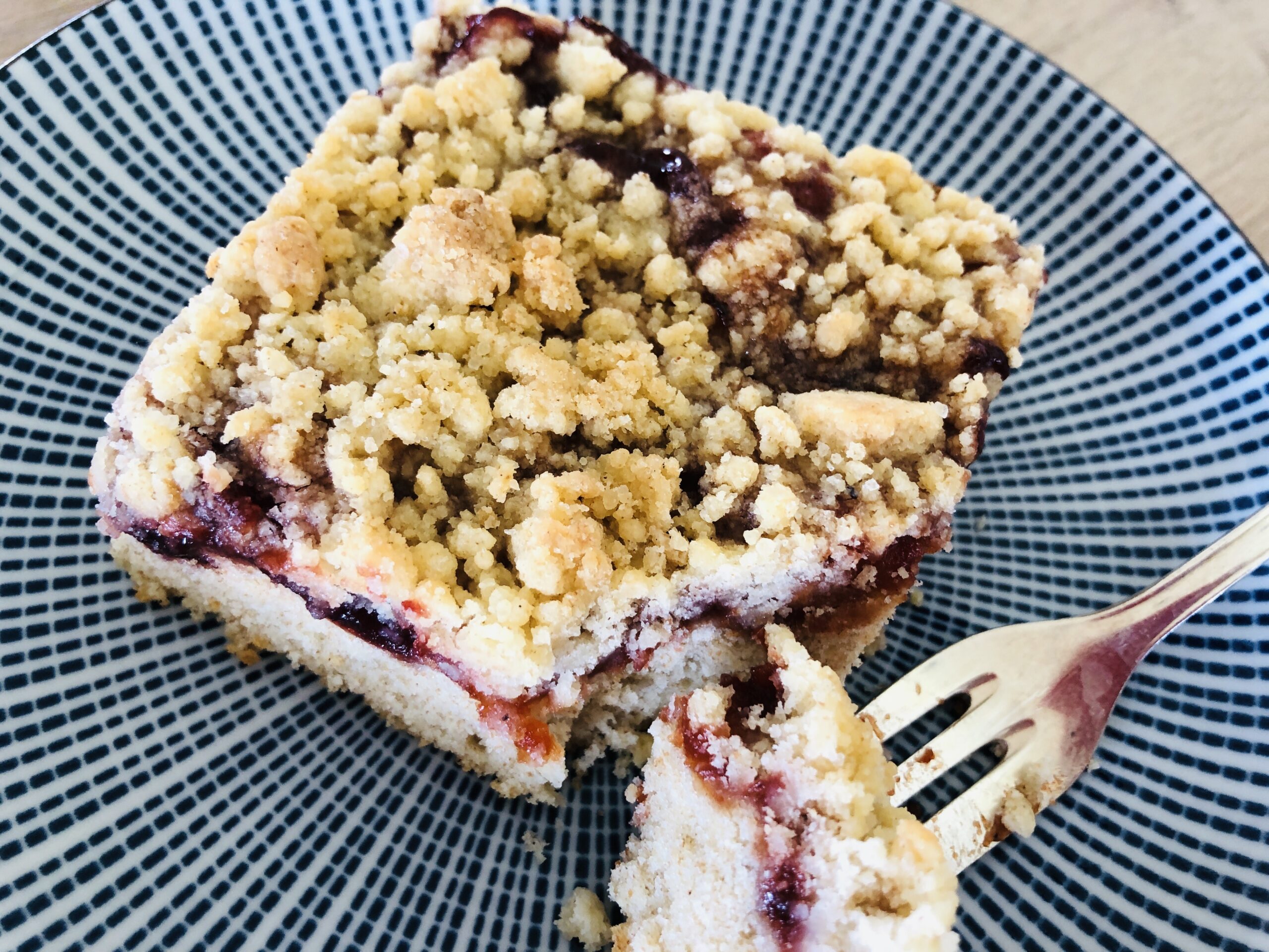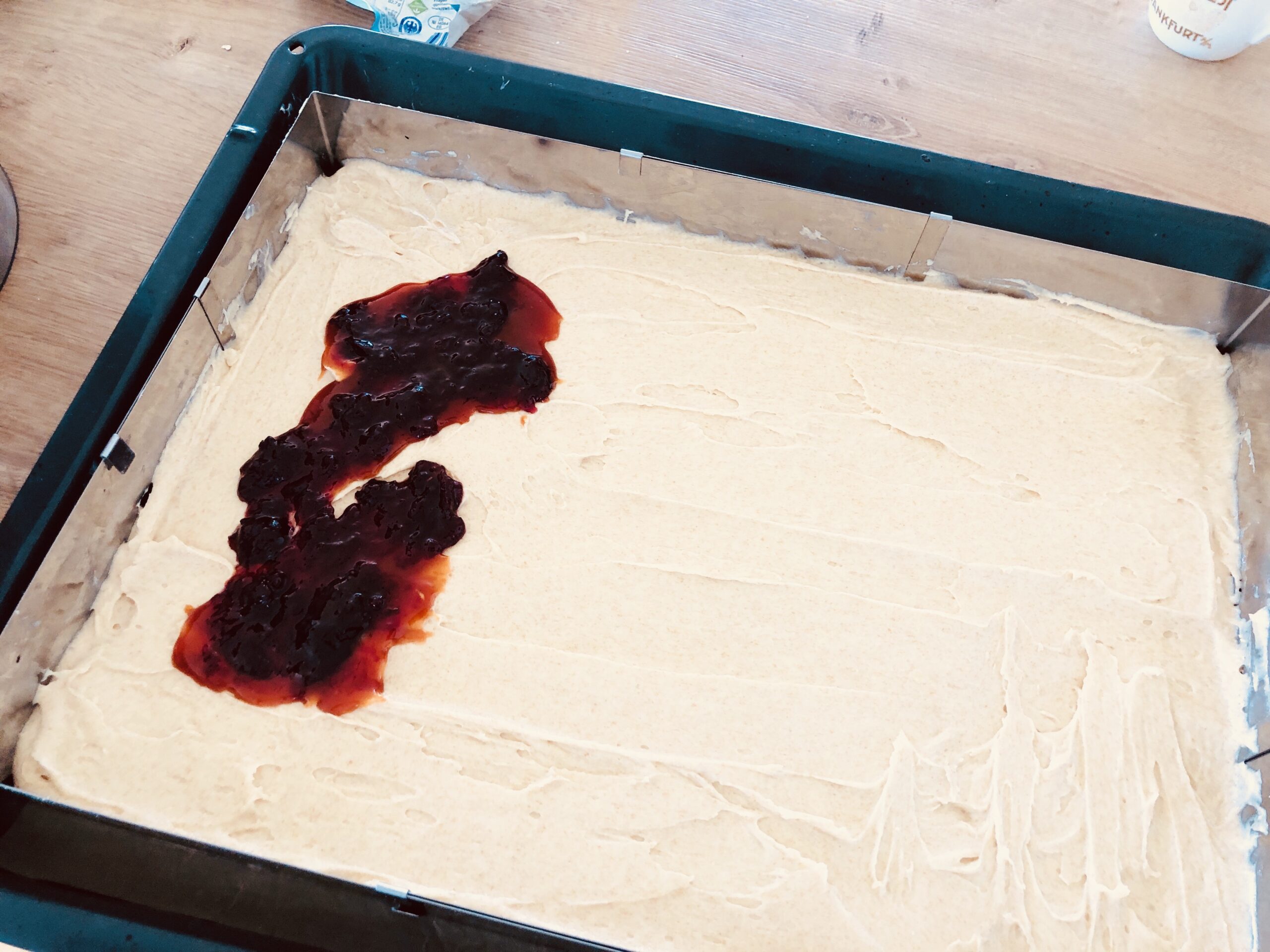 Ich bin immer auf der Suche nach Blechkuchen, die schnell gemacht und gut zu transportieren sind. Da kam mir das kleine Buch: „Lieblingsblechkuchen“ von Anna Walz gerade recht. Ich habe schon einige Kuchen nachgemacht und alle sind gut gelungen. Dieser hier hat es mir besonders angetan, weil man die nötigen Zutaten eigentlich immer im Haus hat. Wir haben im Keller ziemlich viele gute hausgemachte Marmeladen stehen, weil sie gerne verschenkt werden und wir nicht so viel essen. Also ab damit in den Kuchen! Schnell gemacht, einfach und sehr gut!