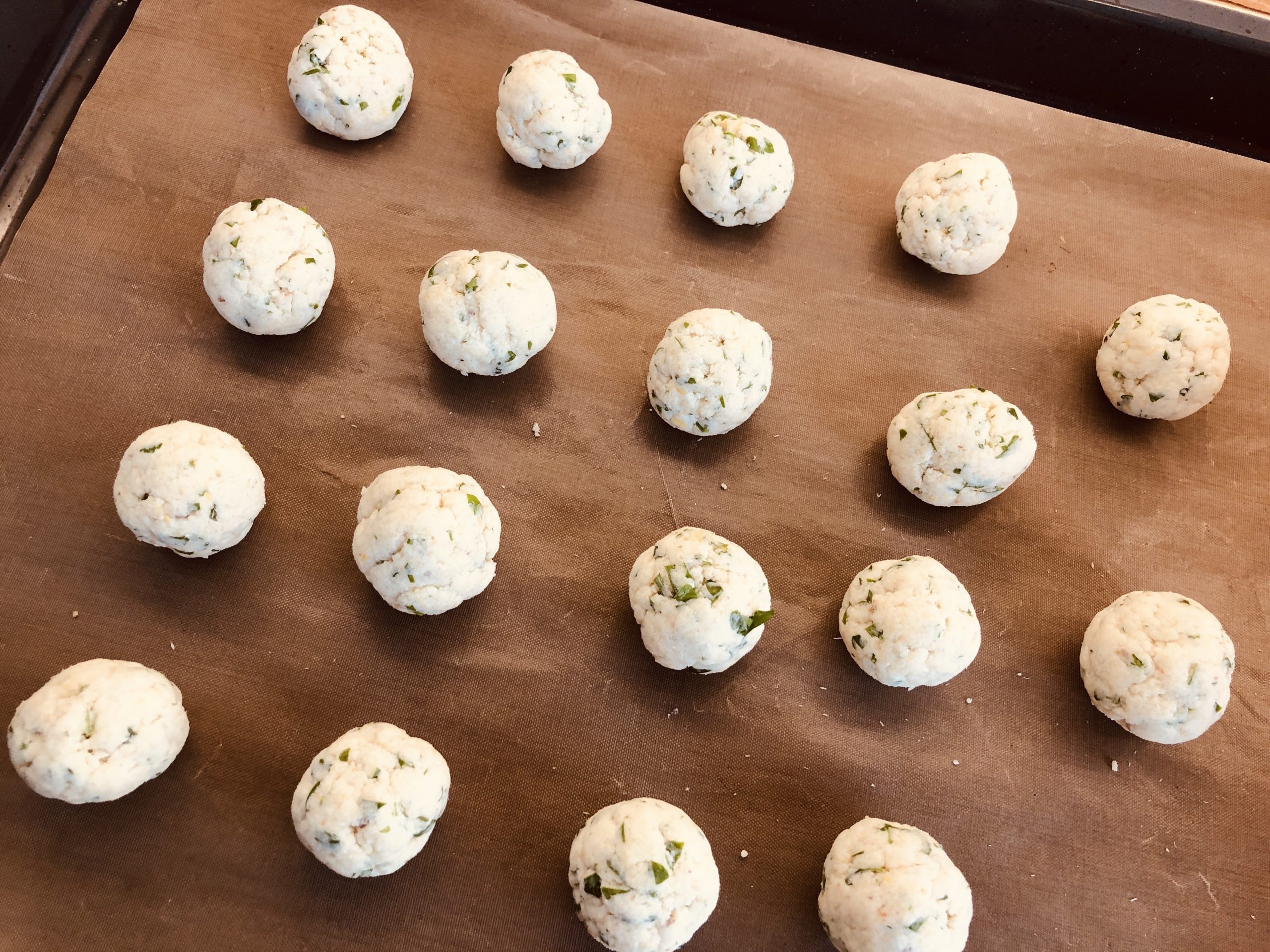 Die Masse zu walnussgroße Bällchen formen, das werden 18 Stück, (genau wie im Original-Rezept !) Auf ein eingeöltes Backblech legen, ich habe eine Silikonmatte genommen.