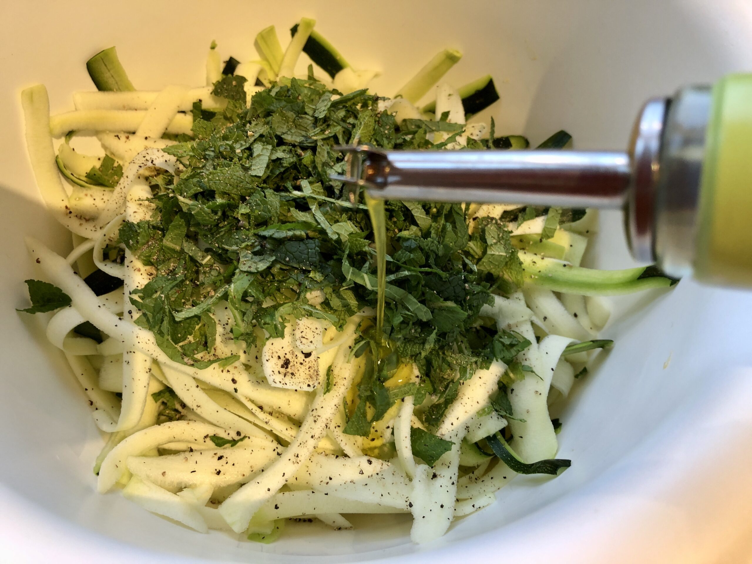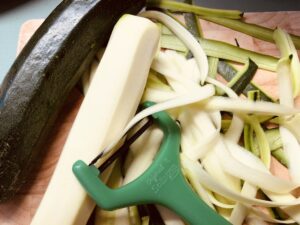 Die Zucchini mit dem Julienne-Schneider in feine Streifen schneiden. Ich habe sie in Ermangelung eines solchen Teils mit dem normalen Gemüse-Hobel geschnitten. Dabei das Kerngehäuse stehen lassen und nicht verwenden.
