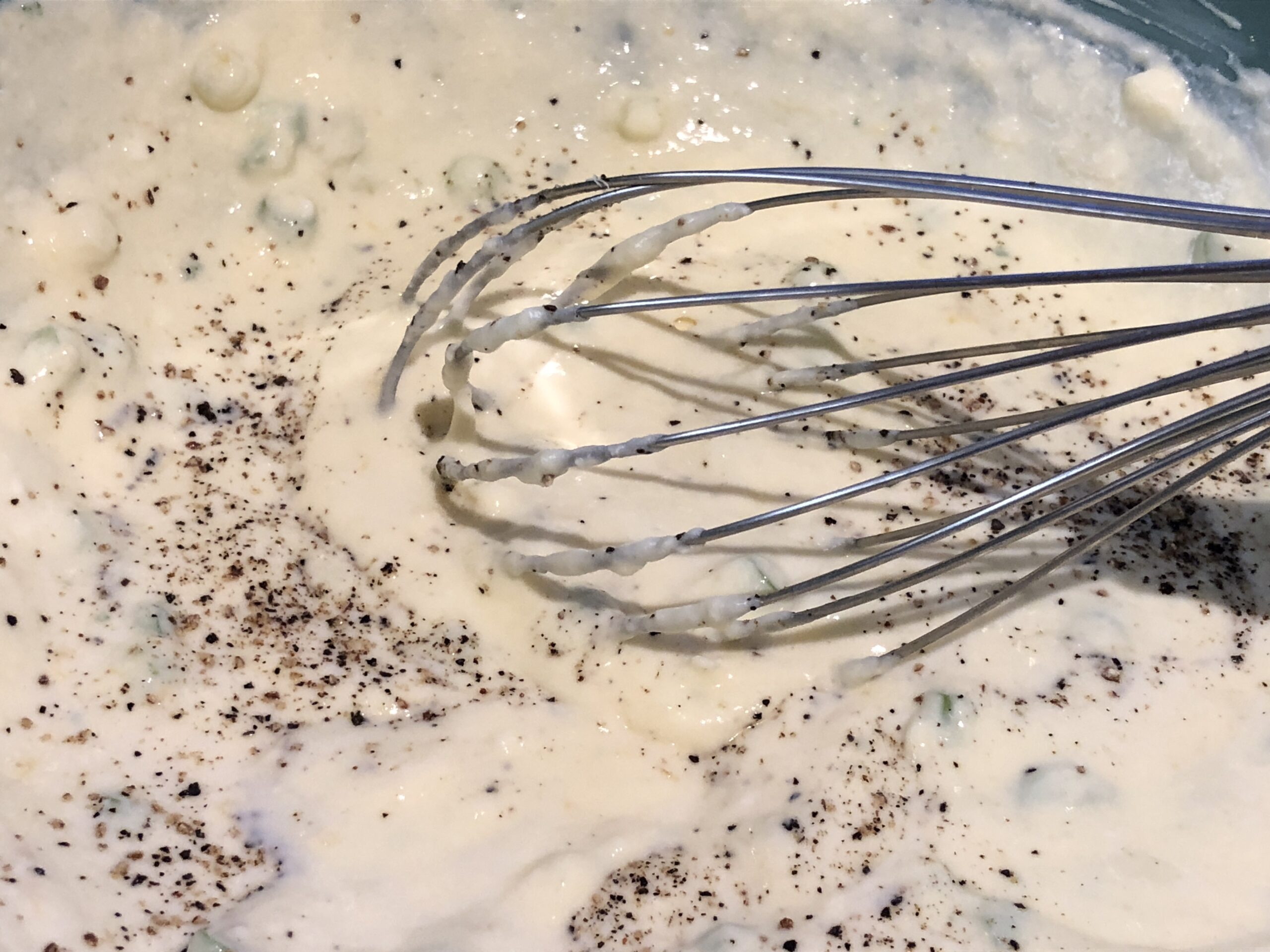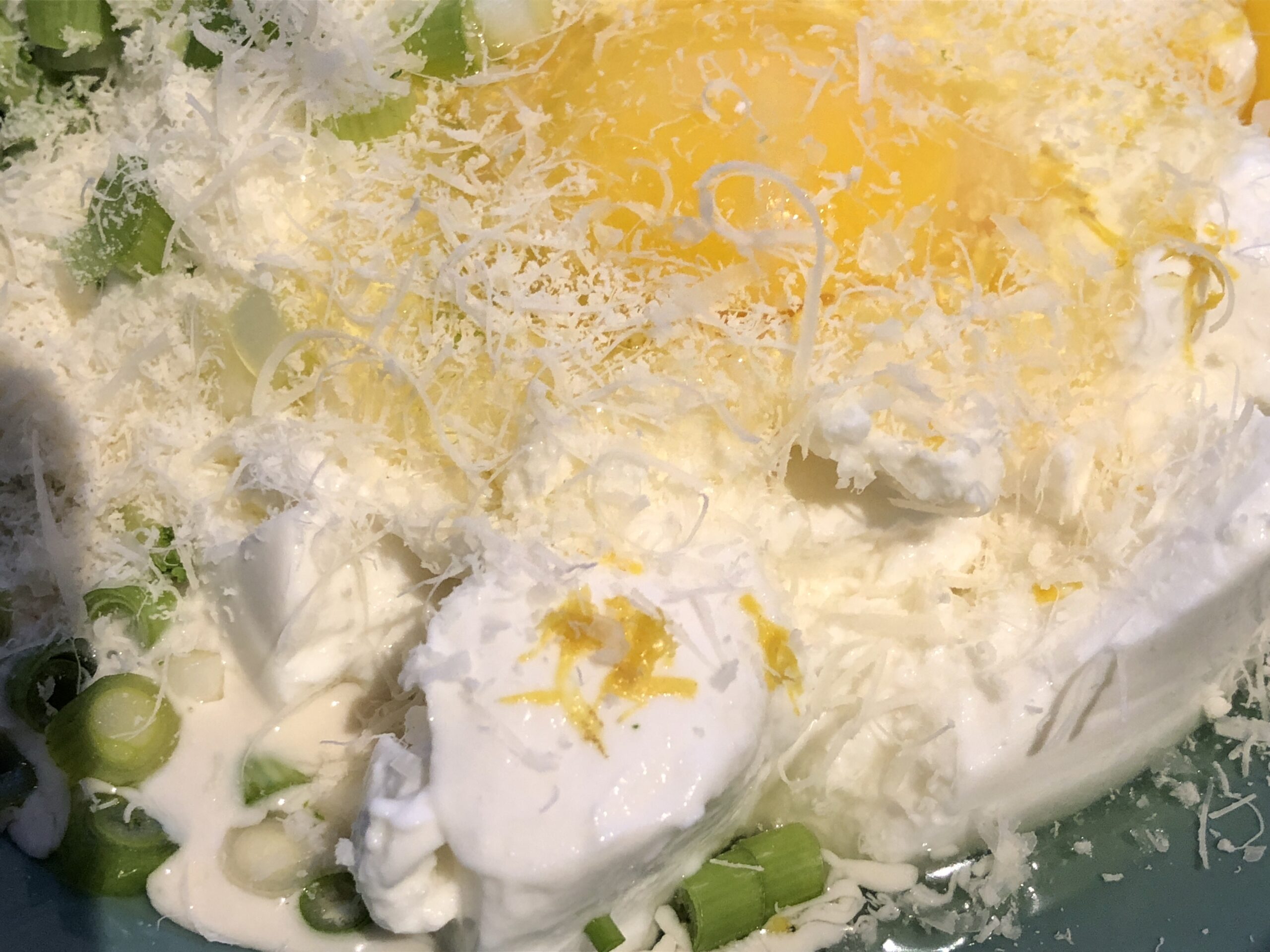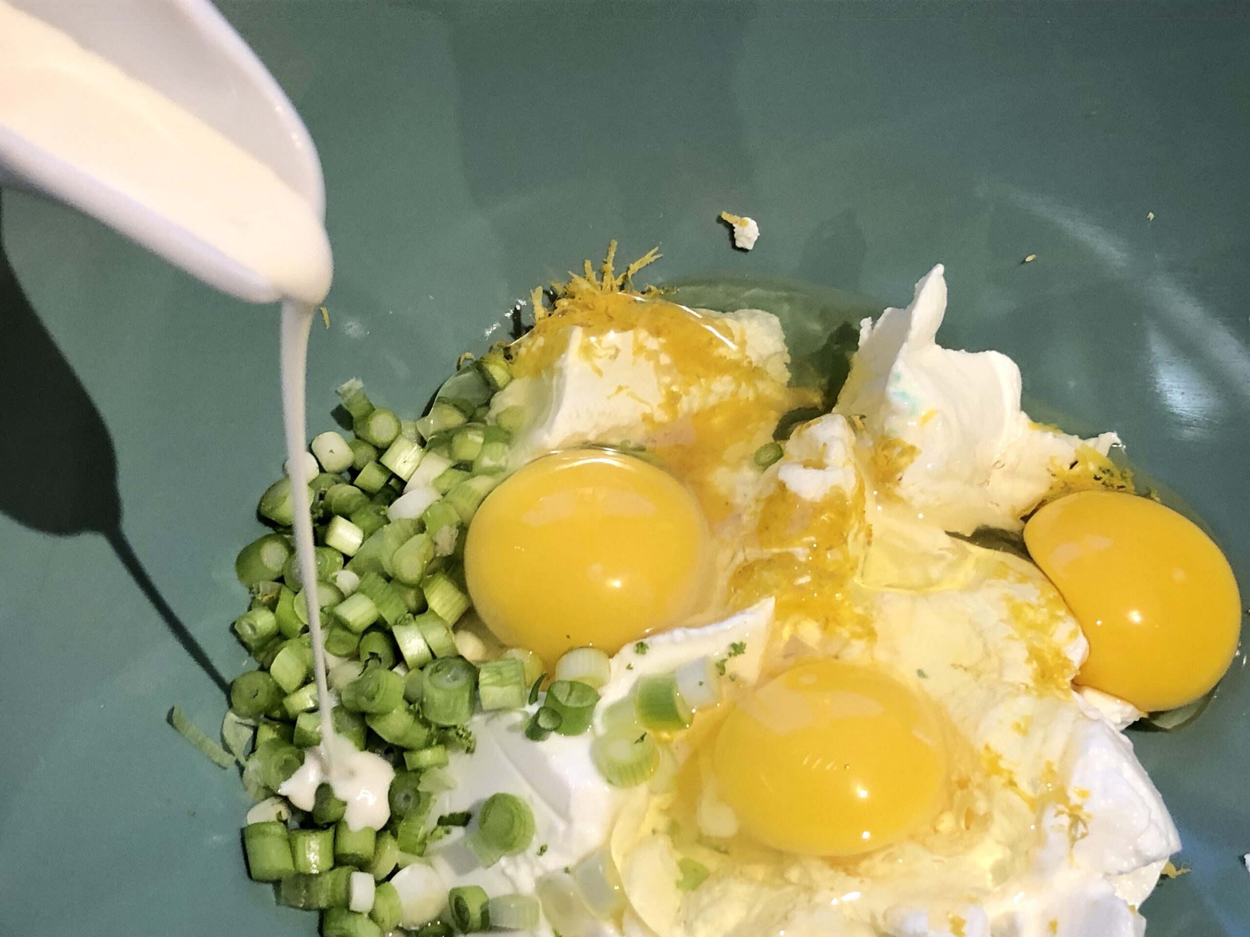 In einer andern großen Schüssel Ricotta, Eier, Milch, Parmesan, Zitronenschale und Frühlingszwiebeln gut vermischen. Mit Pfeffer und Salz würzen.