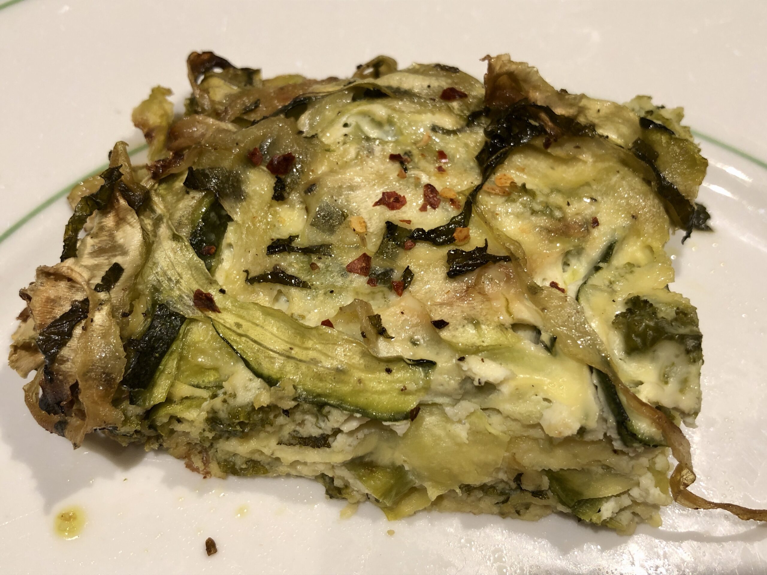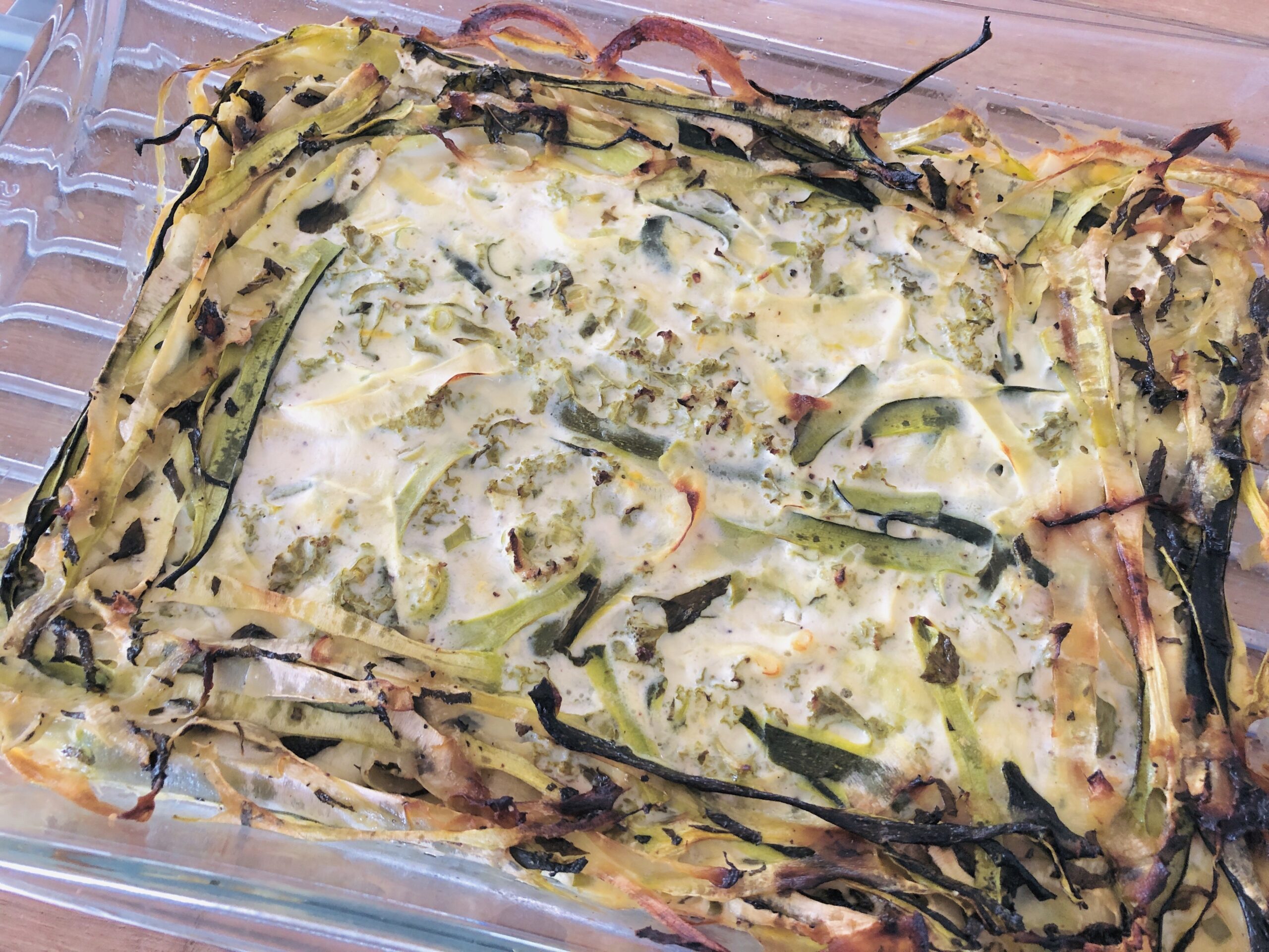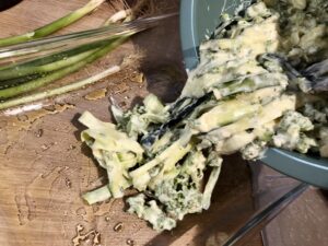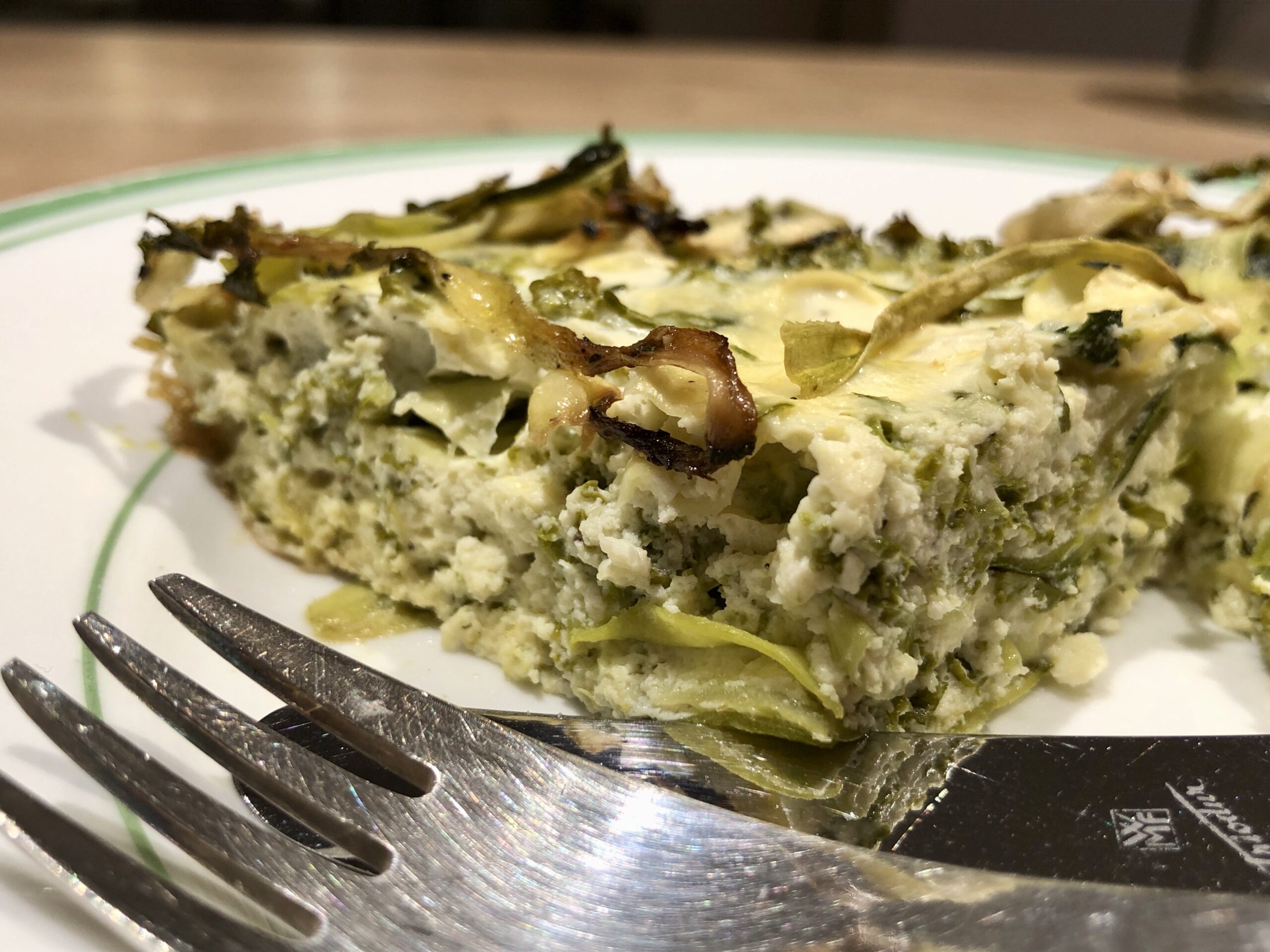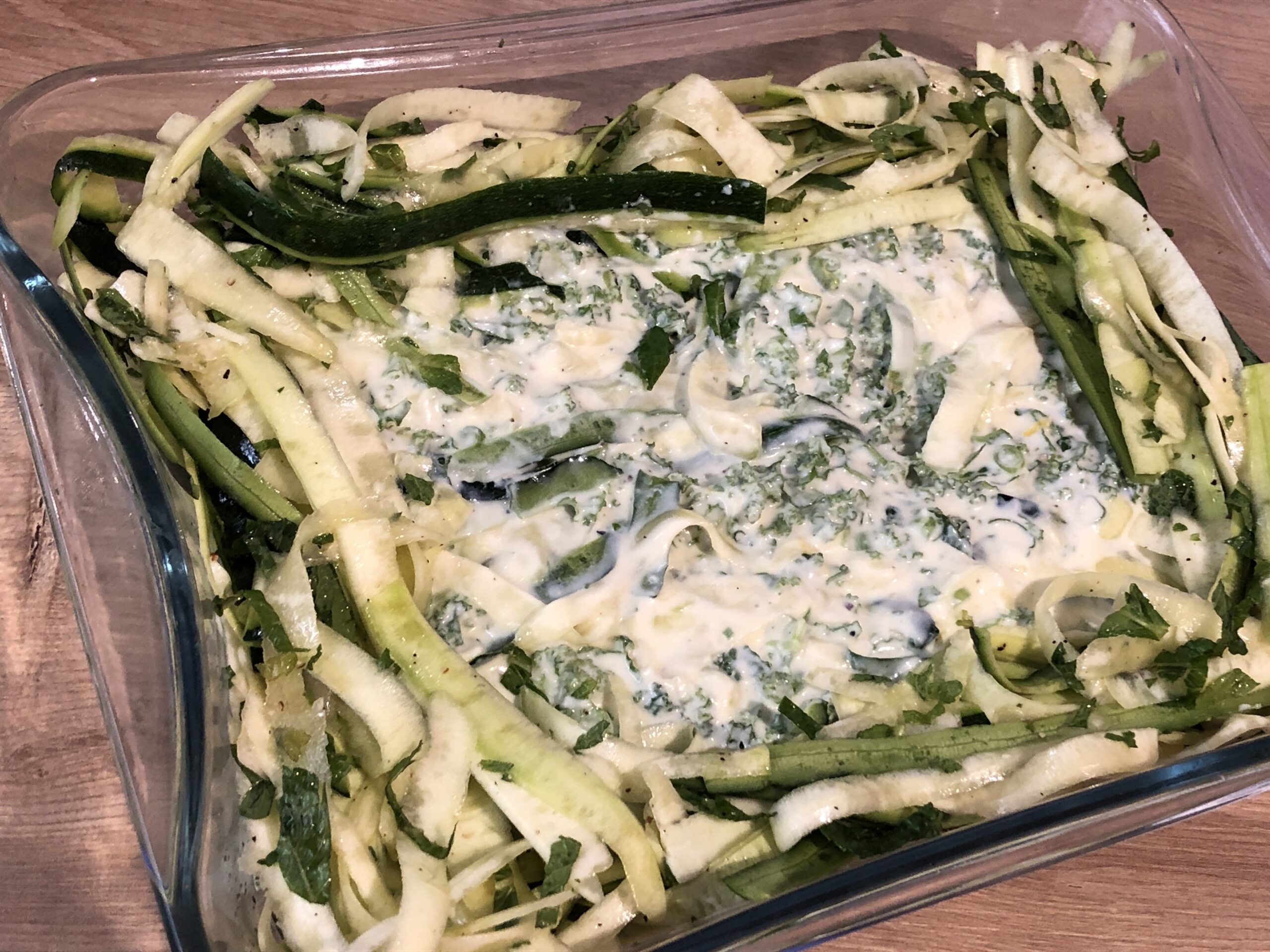 Beim Rezepte recherchieren gucke ich auch immer mal wieder auf den Food – Blog von Donna Hay. Vor vielen Jahren entdeckte ich in einem neuseeländischen Bed and Breakfast fantastische Kochzeitschriften, die mich überraschten und begeisterten. Bis zu dem Zeitpunkt hatte ich keine Ahnung, dass es in Down Under eine so gute Küche gibt. Die Zeitschriften waren von Donna Hay, der preisgekrönten australischen Kochbuchautorin, Fernsehköchin und Foodstylistin, die inzwischen rund 30 Kochbücher veröffentlicht hat. Ihre Rezepte sind modern, pfiffig und meistens leicht nachkochbar. Dieses interessierte mich sofort, auch wegen des ungewöhnlichen Zuschnitts der Zucchini. Man braucht eigentlich einen Julienne-Schneider, den ich aber (noch) nicht hatte. Die Zutaten: Zucchini, Ricotta, Minze und Grünkohl. Der wird in anderen Kontinenten nicht nur im Winter angeboten. Da das hier anders ist, wollte ich das Rezept sofort ausprobieren. Es hat sich gelohnt, es ist ein frischer, fast frühlingshafter Auflauf herausgekommen, der alle sofort begeistert hat. Und er ist wirklich schnell gemacht.