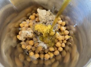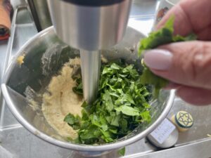 Nach und nach in den Hummus geben, durchmixen und abschmecken.