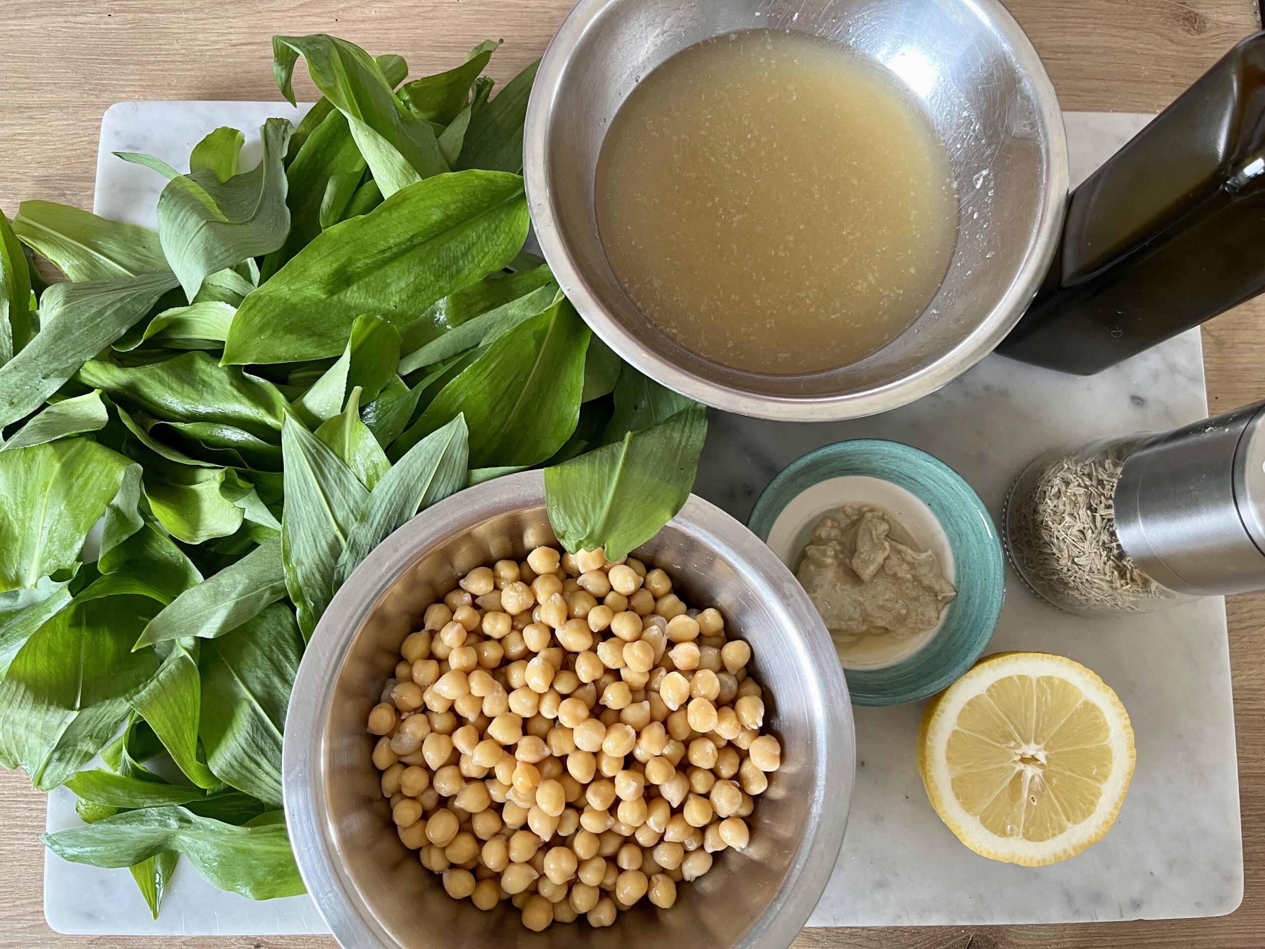 Dieses Jahr habe ich die erste Zeit der Bärlauchsaison verpasst, aber wenn man dem Winter entflieht, muss man auch auf etwas verzichten. Mitte März habe ich mich aber mit Elan ans Kochen und Mixen gemacht. Ich habe ja genug Rezepte auf dem Blog. Neu ist eine Bärlauchbutter mit Miso und ein Bärlauch-Hummus. Der ist schnell gemacht, sieht toll aus und schmeckt köstlich. Ich mache den Hummus  selbst, aus getrockneten regionalen Kichererbsen. Weil man ja nicht immer daran denkt, sie rechtzeitig einzuweichen, mache ich eine große Portion auf Vorrat. Das heißt, ich weiche sie ein und koche sie (mit Salz, Natron, einem Schuss Olivenöl und Lorbeerblättern)  und stelle mir den Teil, den ich nicht sofort verwende in der Kochbrühe in den Kühlschrank oder friere ihn sogar ein. So habe ich immer gute  zubereitungsfertige Kichererbsen im Haus und kann jederzeit einen Hummus zaubern, den ich mit verschieden Zutaten variiere . Heute wird er grün und ist in Nullkommanichts fertig. Die Bärlauchblätter sind gegenüber im Wald schnell gepflückt und los gehts.