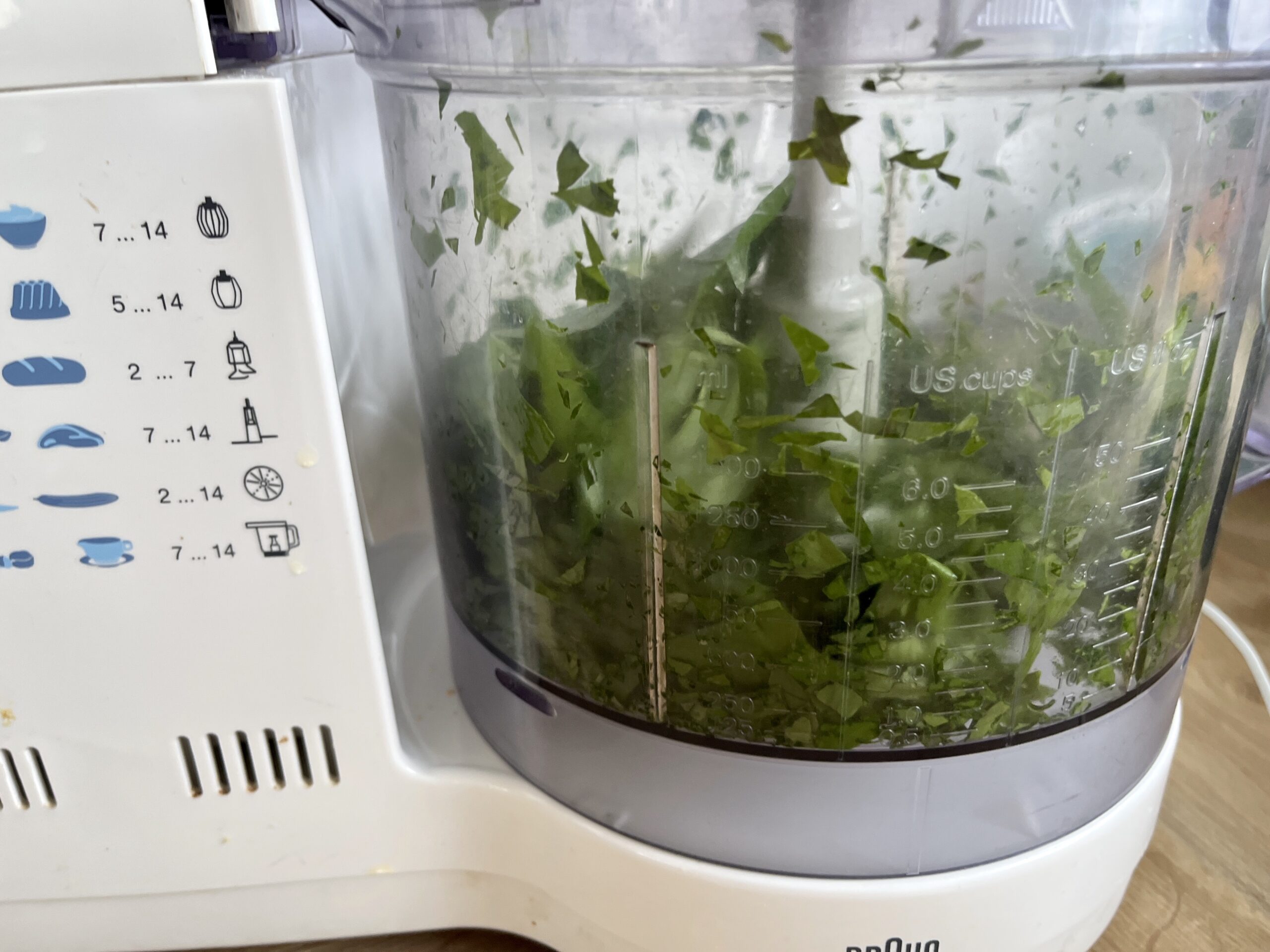 Nach persönlichen Gusto abschmecken. Normalerweise kommt auch Knoblauch in den Hummus, aber in diesem Fall wird er natürlich weg gelassen. Den Bärlauch warm waschen und in der Maschine oder mit der Hand grob hacken.