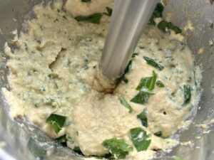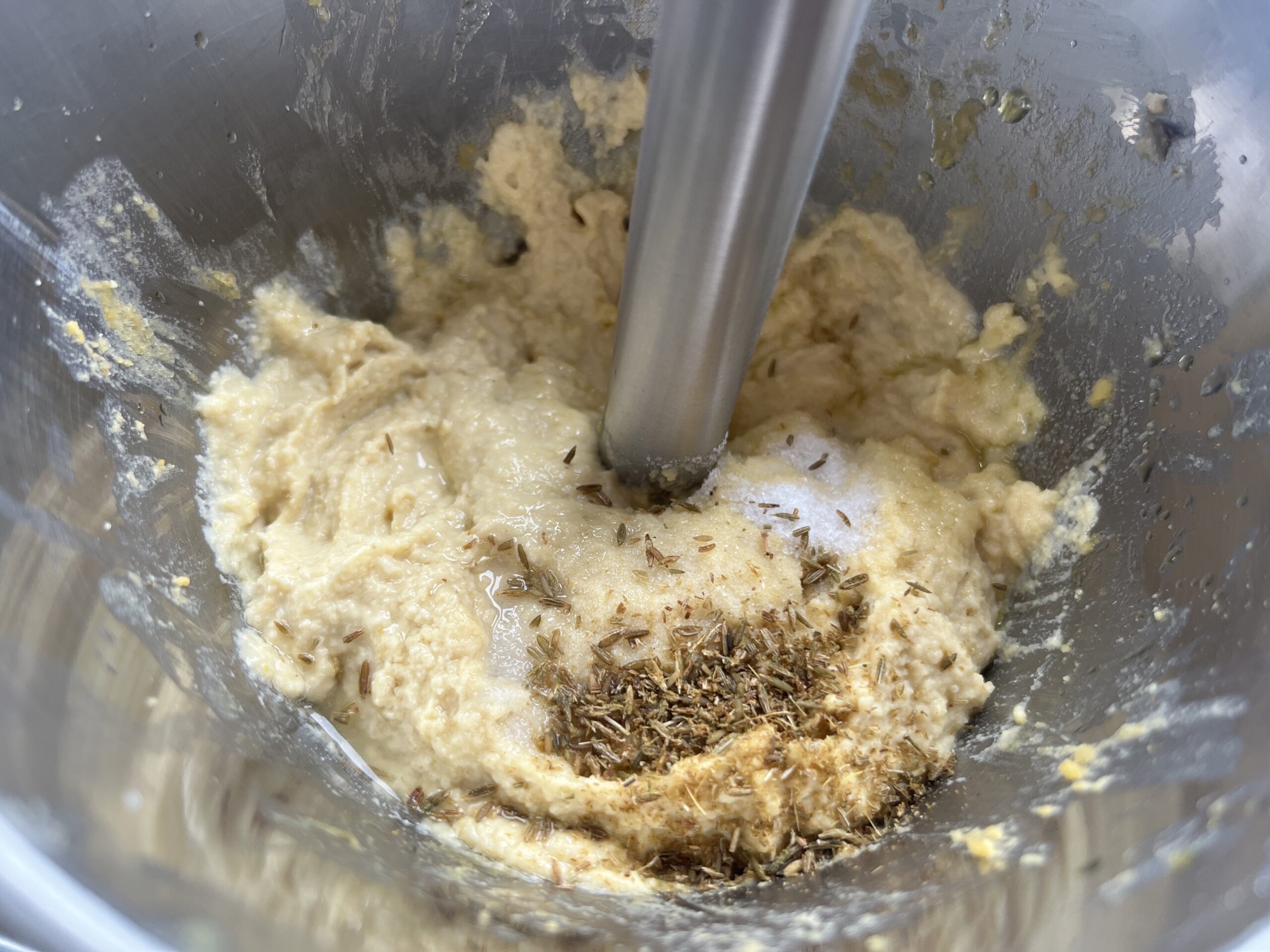 Zuerst bereite ich den normalen Hummus zu: alle Zutaten außer dem Bärlauch werden in einem hohen Gefäß mit dem Stabmixer zu einer weichen Paste verrührt.
