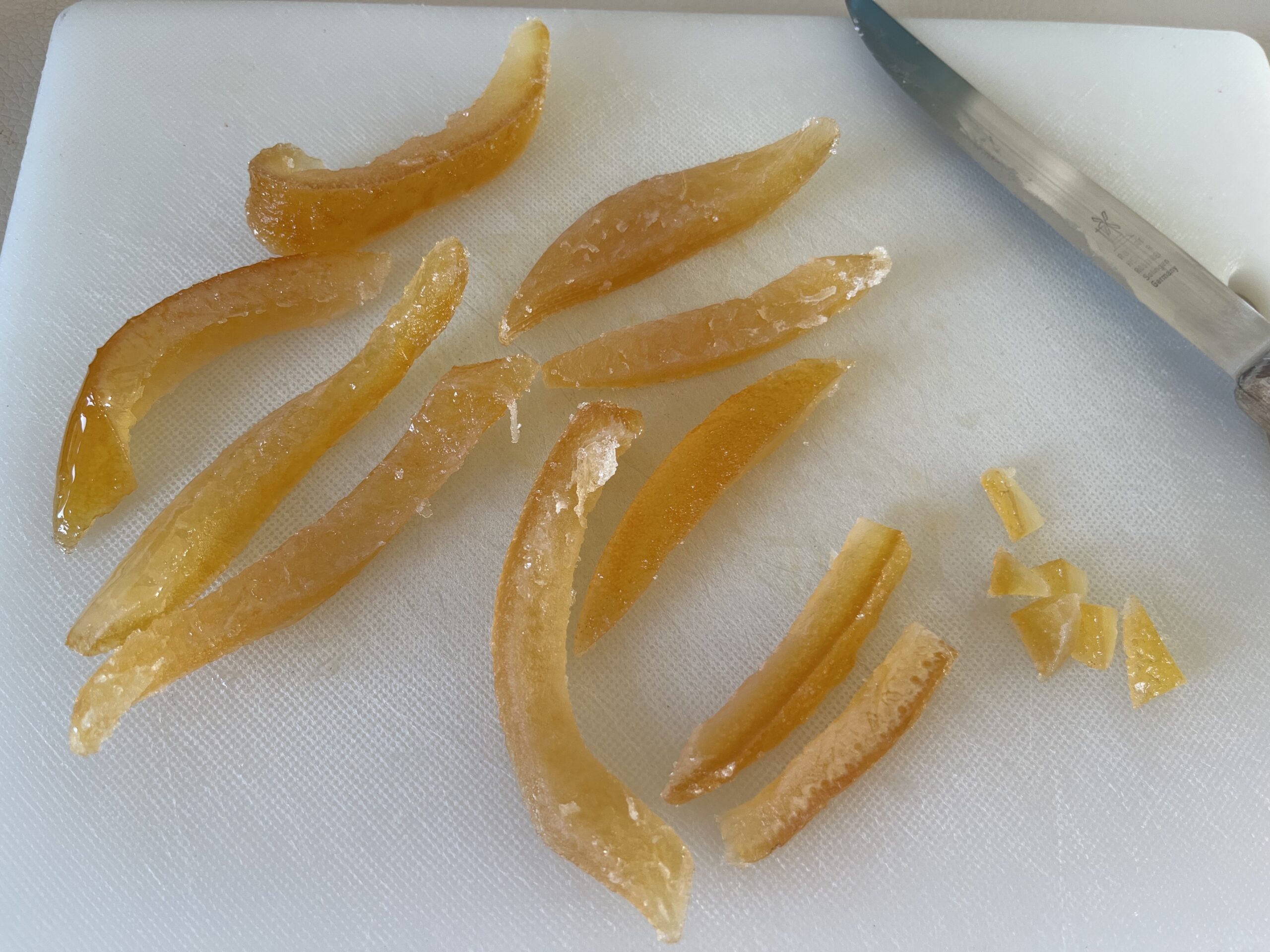 - Zitronat und Orangeat in kleine Würfel schneiden (besonders gut von halbierten kandierten Früchten, im Internet erhältlich)