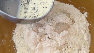 - erst die Milch, dann das Fett in das Mehl geben, verrühren.