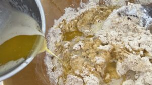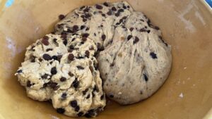 hier sieht man den Unterschied, der rechte Teil ist schon mit der Maschine geknetet, der Linke noch nicht.