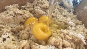 - Eier, Mandeln, Zucker und die anderen Zutaten dazugeben, mit der Hand und dann portionsweise in der Maschine gut kneten.