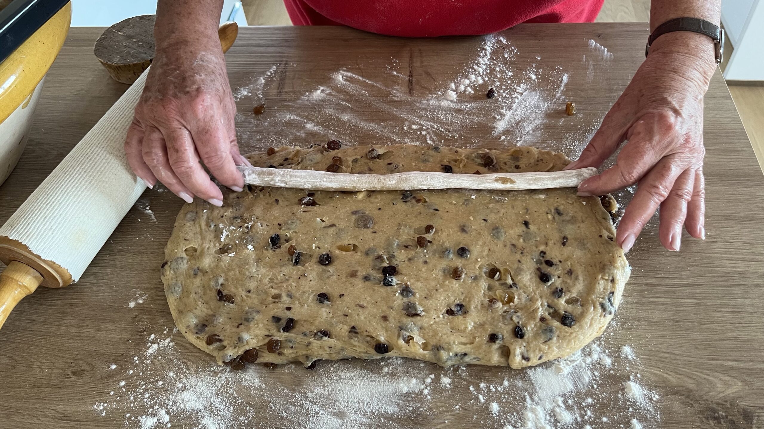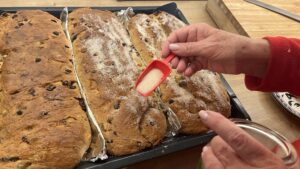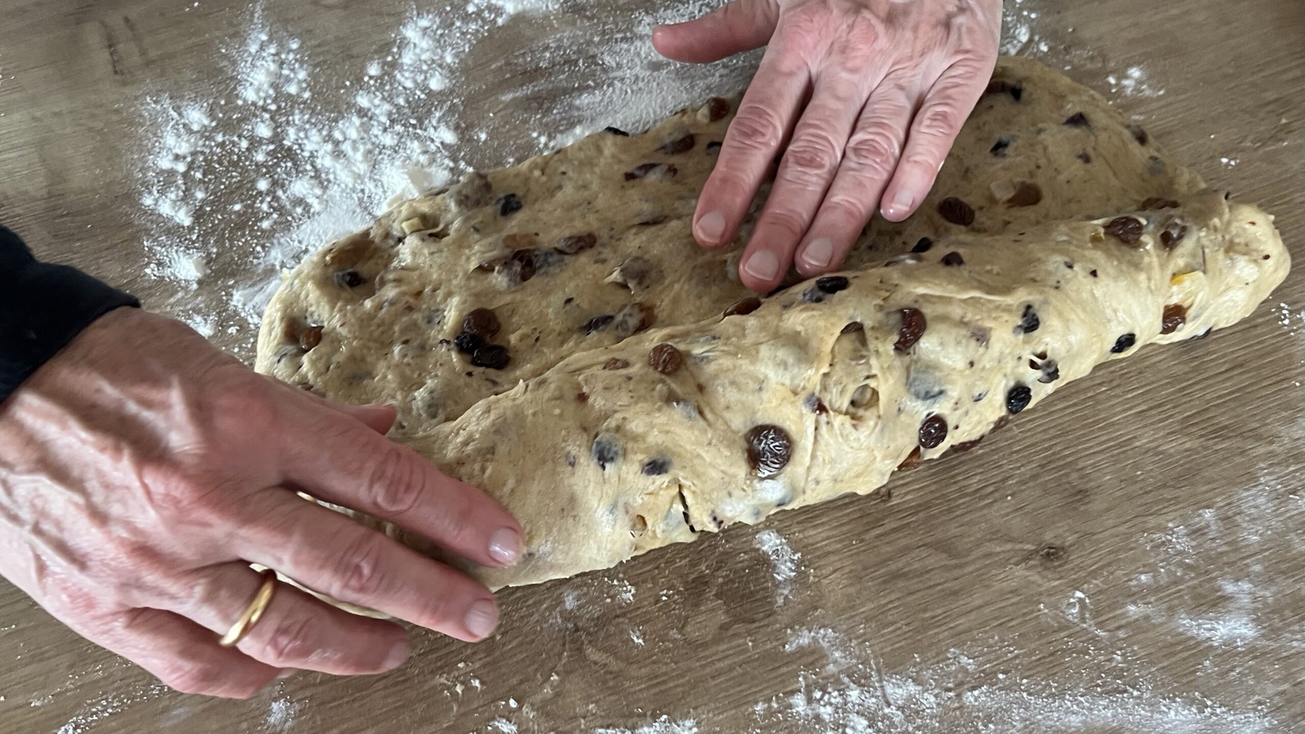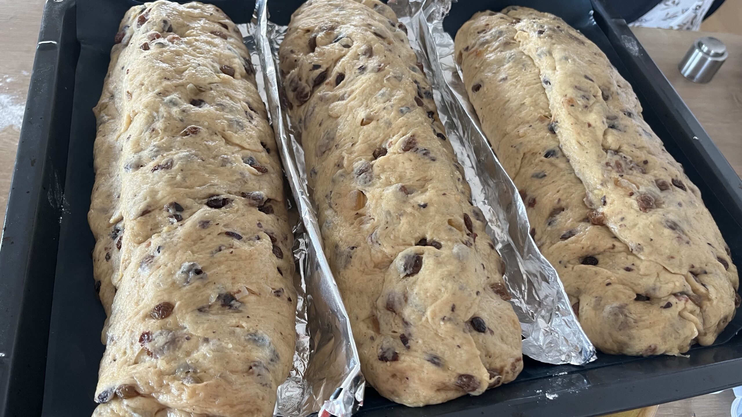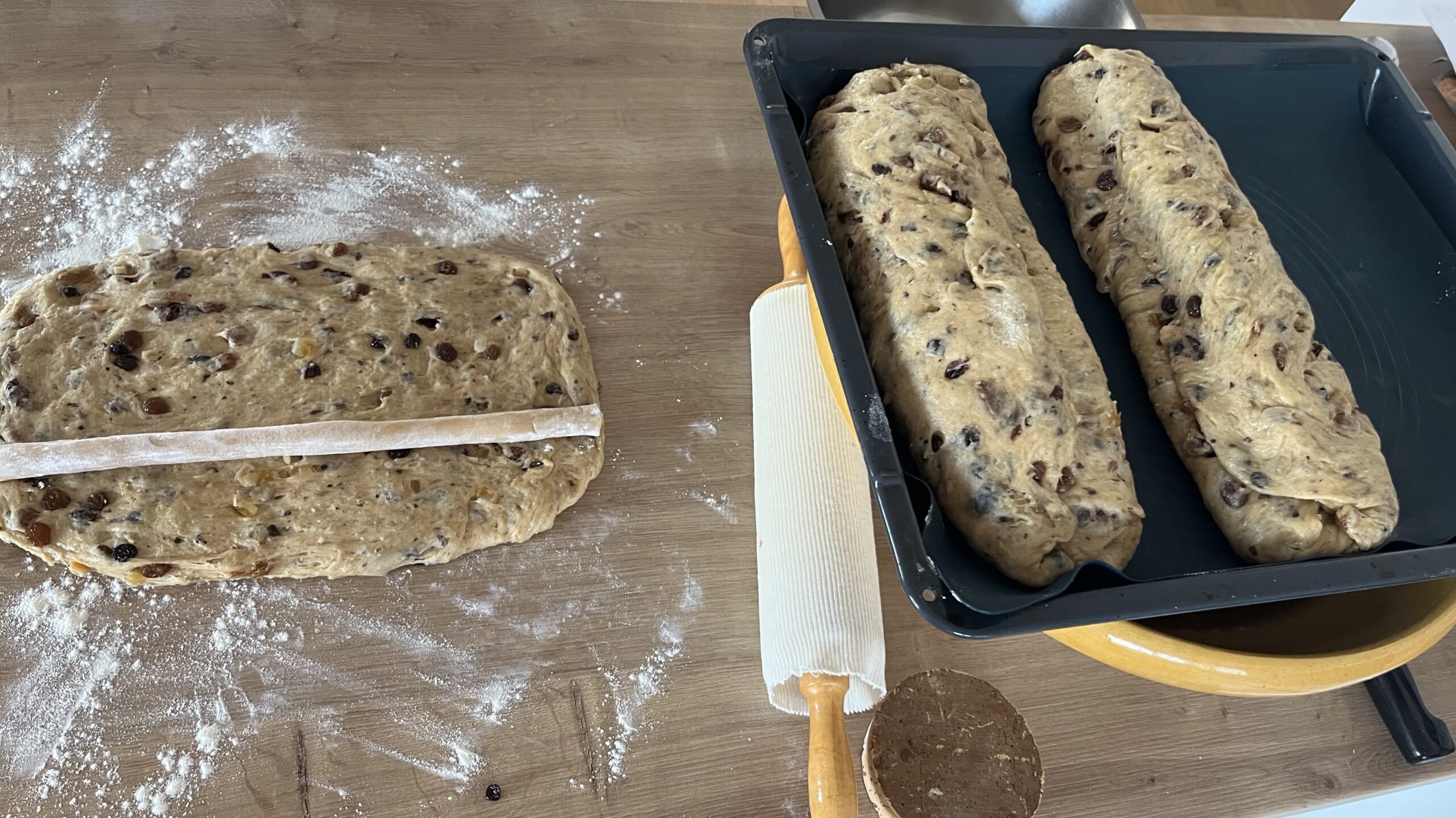 - Wenn der Teig gegangen ist, 3 Stollen formen, dabei Marzipan einlegen.
