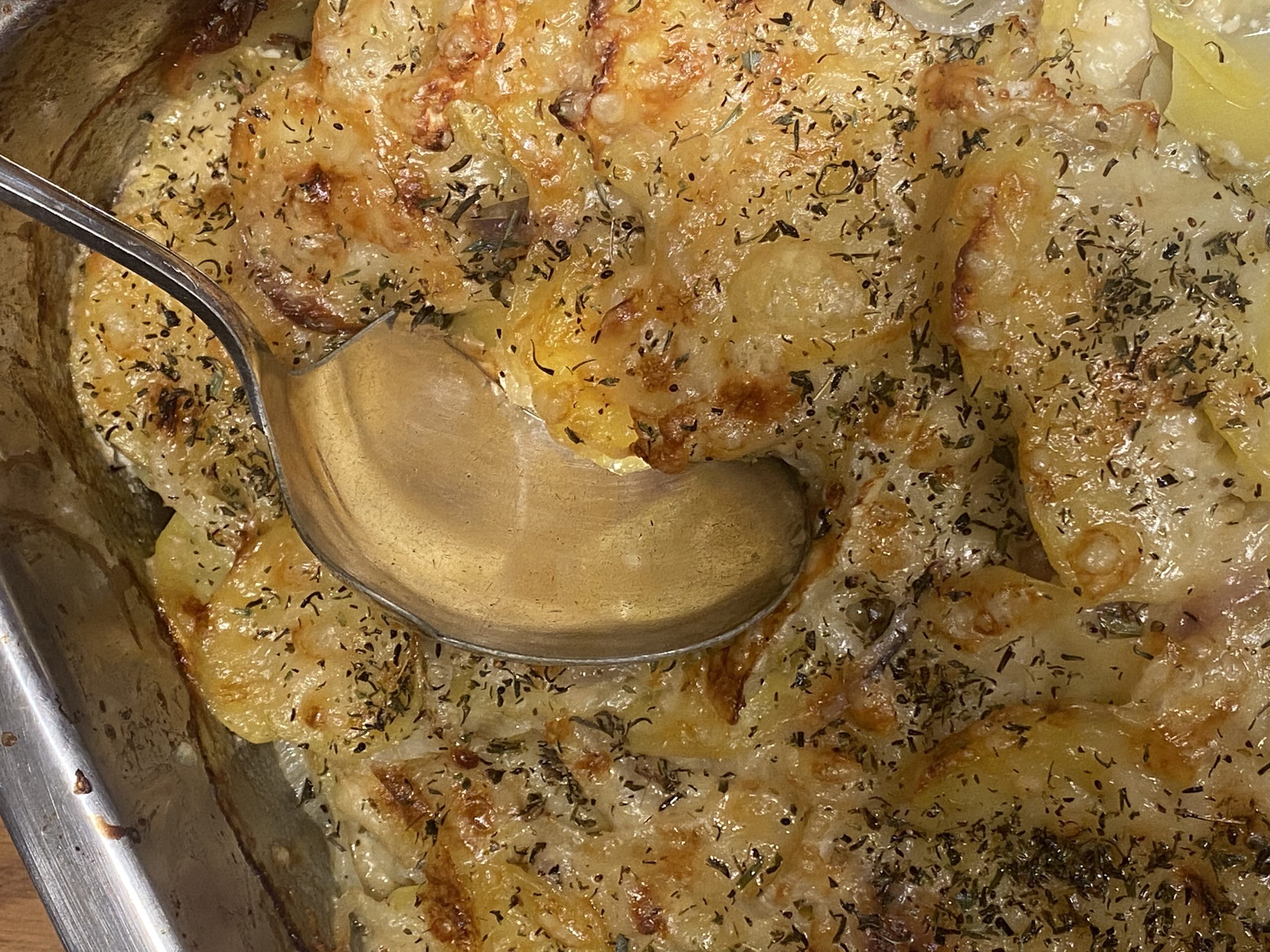 Mit der Sahnemilch übergießen. Mit Alufolie abdecken und ca 40 Minuten backen, bis die Kartoffeln weich sind. Käse darüber streuen und ca 10 Minuten weiter backen. Wenn man die Kruste richtig braun haben will, kann man auch den Grill einschalten. Das Gratin mit dem Bohnenkraut bestreuen und genießen. Vorsicht heiß!