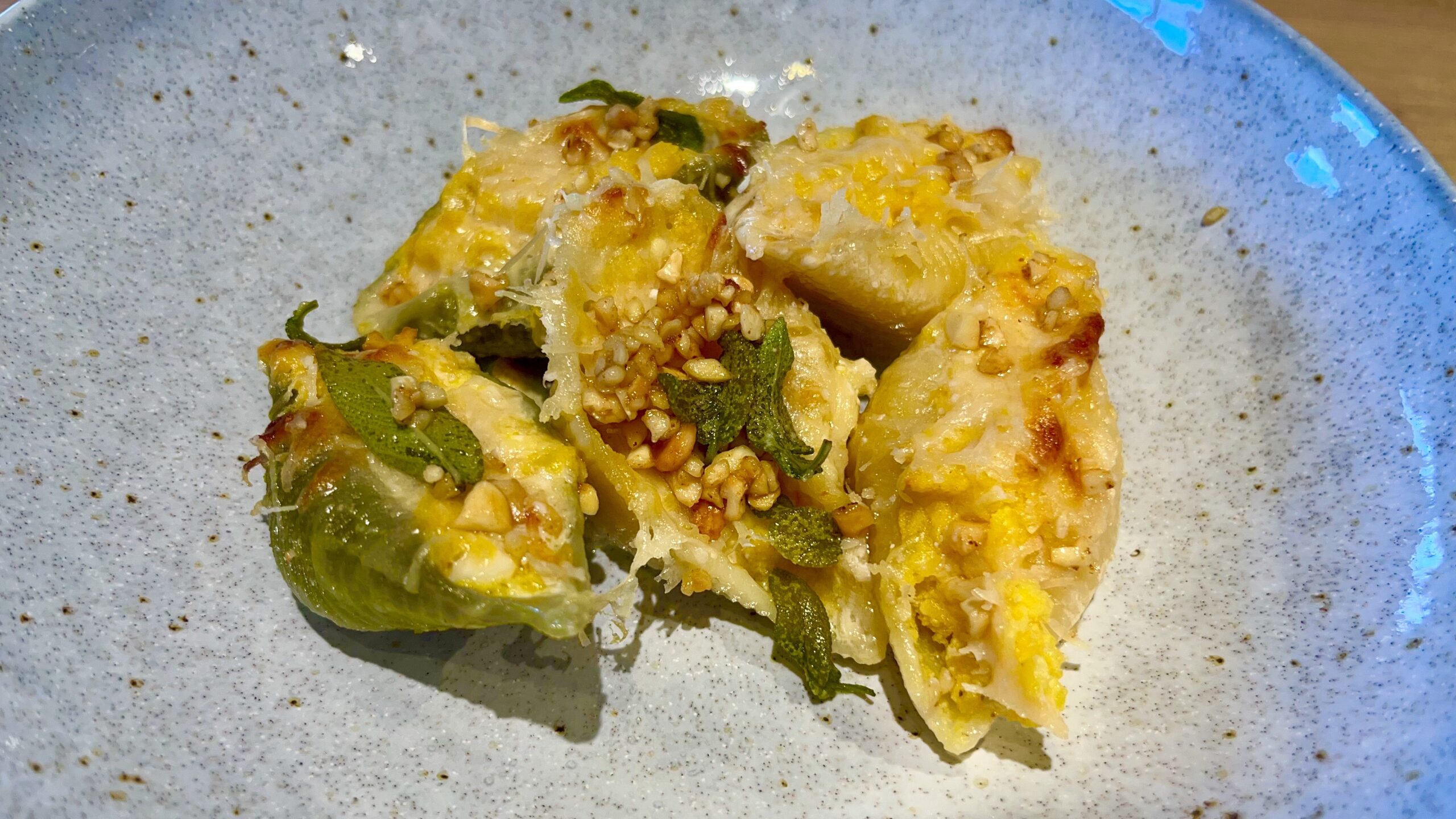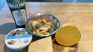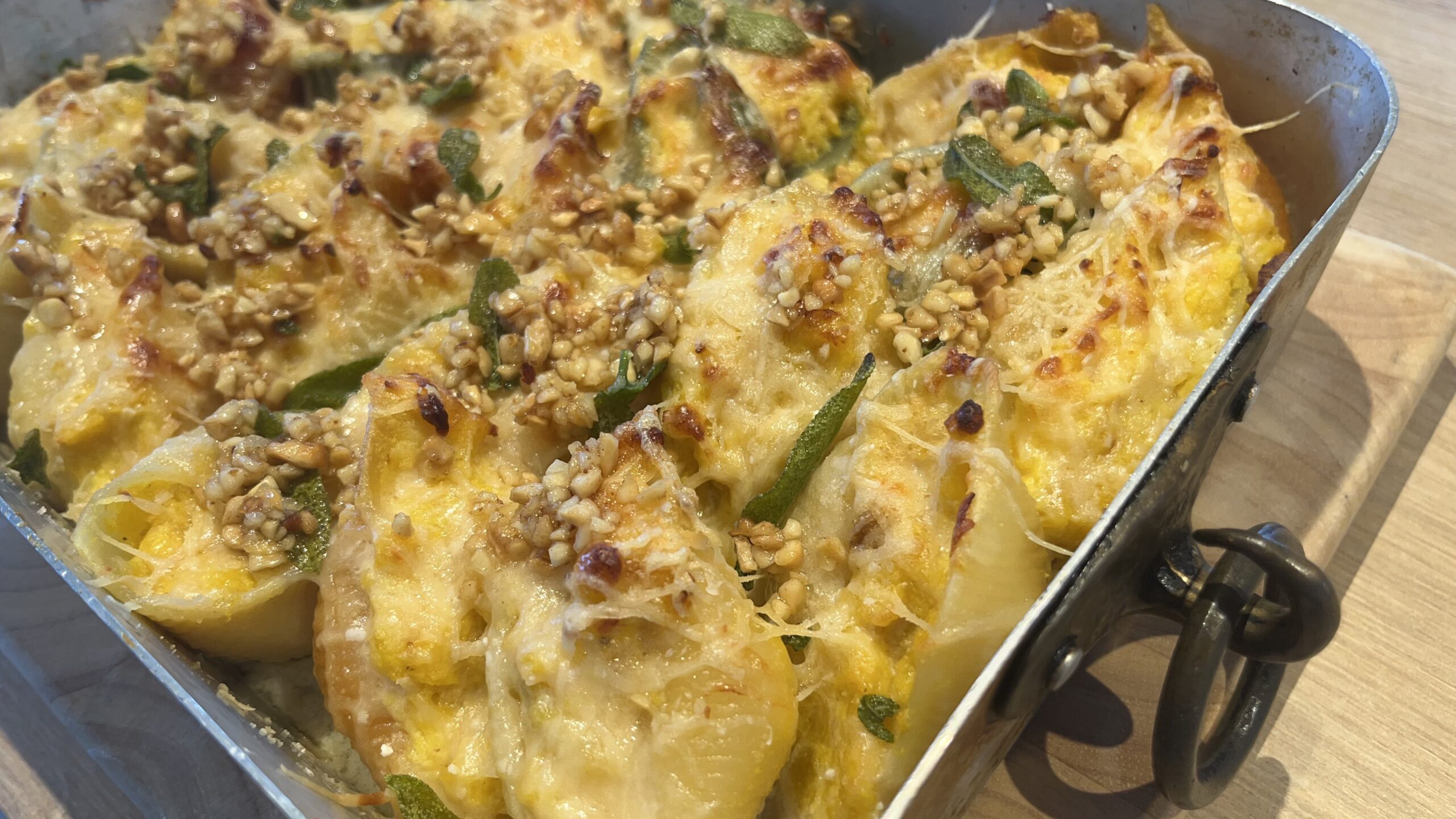 Auf meinen kulinarischen Entdeckungsreisen im Netz bin ich kürzlich auf dieses wunderbare Rezept gestoßen: mit Ricotta, Kürbis und Parmesan gefüllte Riesenmuschelnudeln, gebadet in Sahne und Noilly Prat, überbacken und gekrönt von in Butter gebratenem Salbei und Haselnüssen. Ich hatte schon beim Lesen den köstlichen Geschmack auf der Zunge und meine Erwartungen wurden voll erfüllt. Noilly Prat ist ein französischer Vermouth, der in jeder gehobenen Küche verwendet wird. Ich habe immer eine Flasche da. Man kann ihn in diesem Rezept durch Brühe mit Zitronensaft oder Weißwein ersetzen. Die Pasta, auf italienisch Conchiglioni, bekommt man zwar nicht in jedem Supermarkt, ist aber doch gut zu finden. Das Füllen der Nudeln ist etwas knifflig, ich bin früher daran verzweifelt. Das war dieses Rezept: