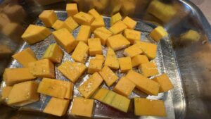 Den Kürbis schälen und in grobe Stücke schneiden.