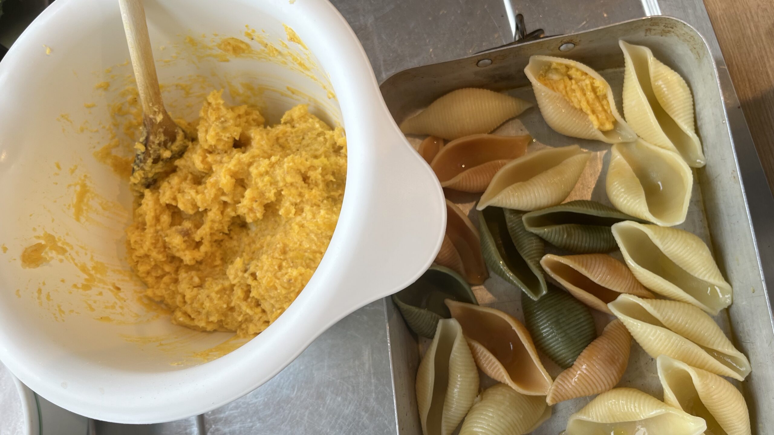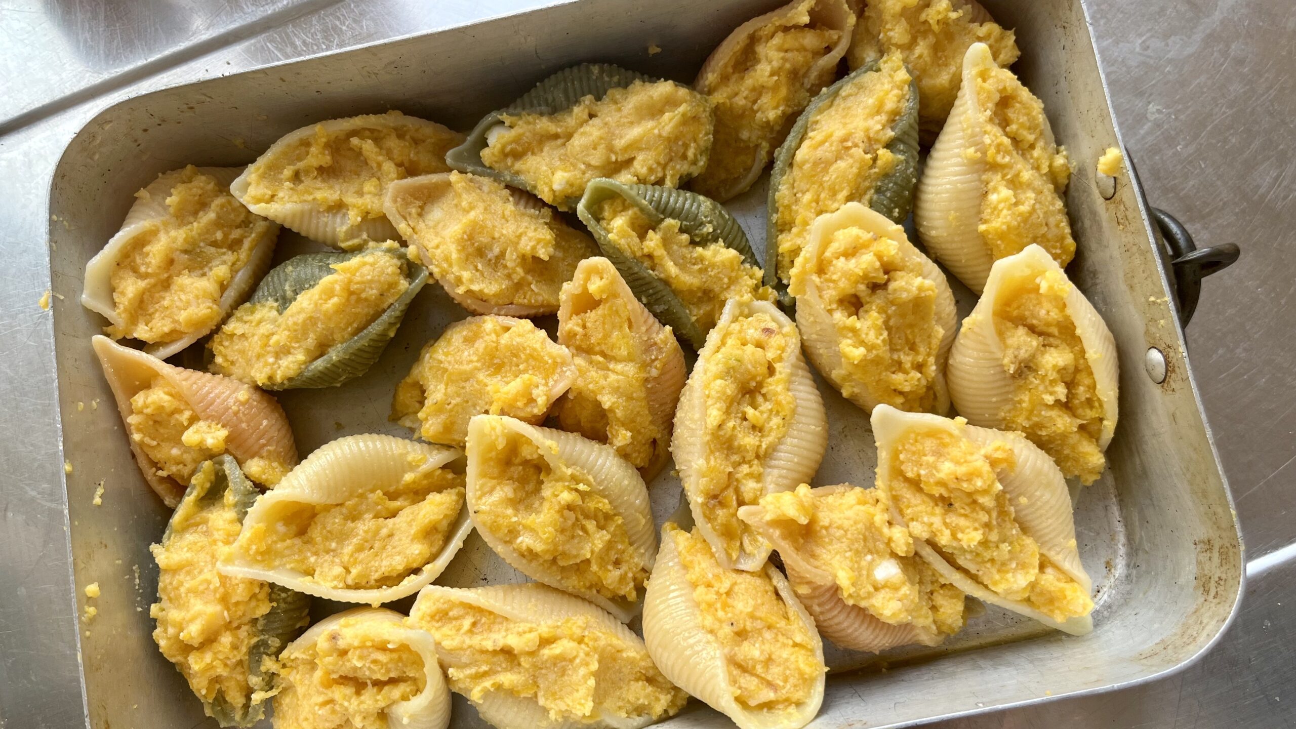 Ricotta mit dem Parmesan, Knoblauch, Zitronenabrieb, Muskat und den Eigelben vermischen. Den Kürbis aus dem Ofen kurz abkühlen, mit einem kleinen Kartoffelstampfer zerdrücken und mit der Ricottamasse vermischen, abschmecken. Die Nudeln mit etwas Olivenöl besprenkeln und einzeln mit der Ricotta-Kürbis-Mischung füllen und in eine ofenfeste Form setzen.